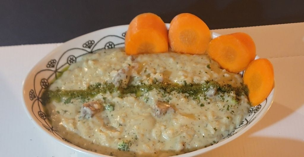 예쁘게 플레이팅 해준뒤, 바질과 당근으로 예쁘게 꾸며주면 초록초록한 리조또 완성입니다!