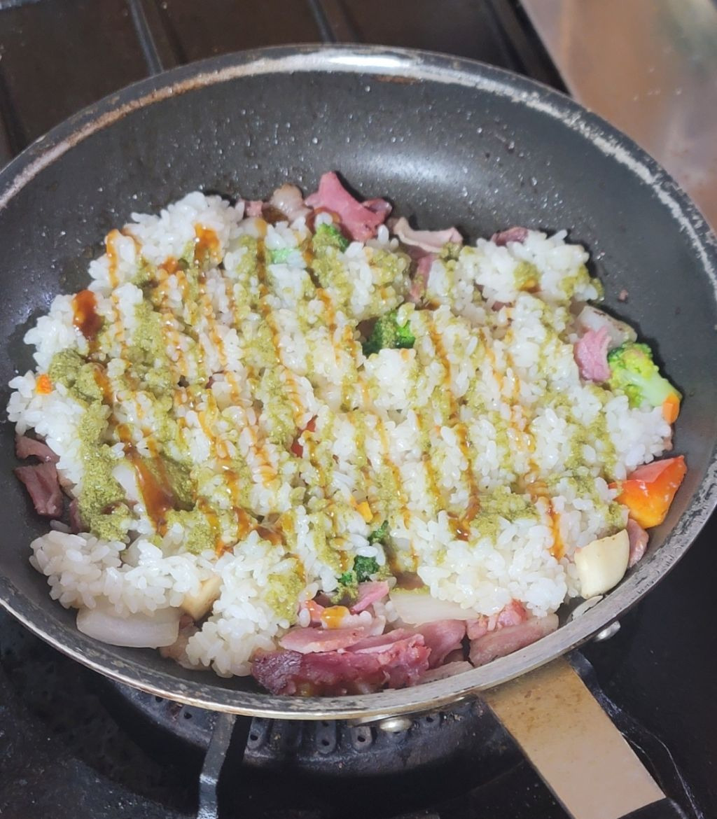-당근, 파프리카, 브로콜리, 새송이 버섯, 양파, 밥, 베이컨, 올리브유, 바질페스토 & 굴소스