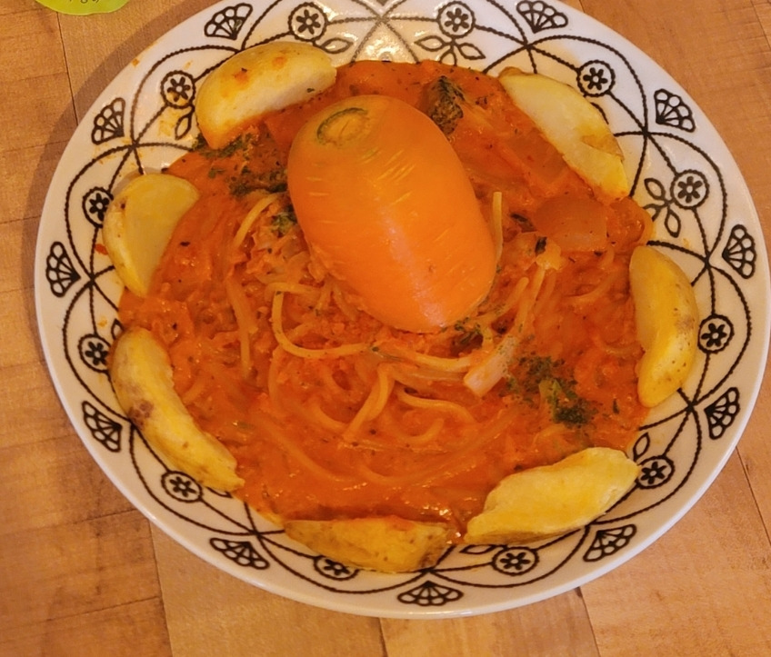 파스타를 예쁘게 접시에 올려주고, 감자와 남은 당근으로 플레이팅 해주면!