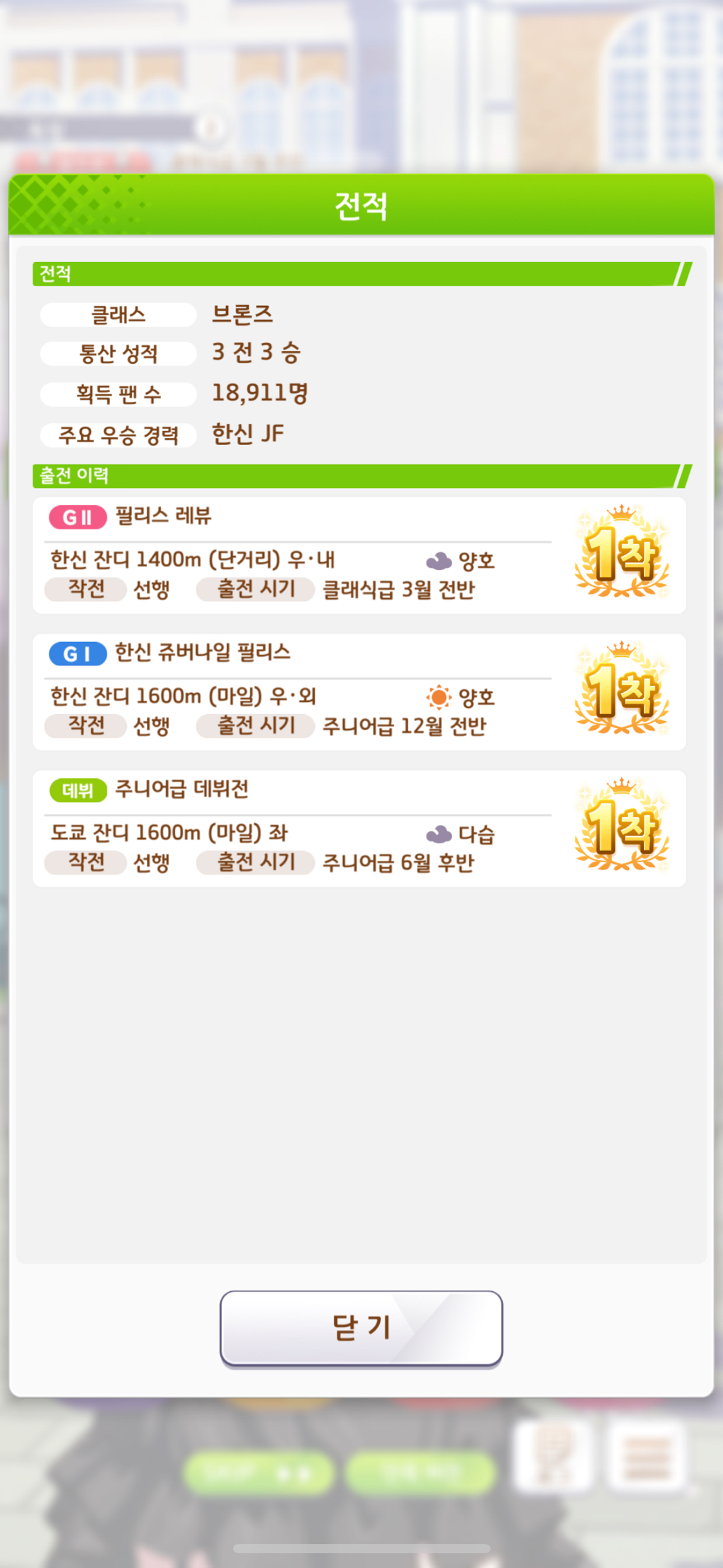 우마무스메에 같은 경기장과 거리를 쓰는 ‘필리스 레뷰‘가 있어 1착을 따냈습니다!