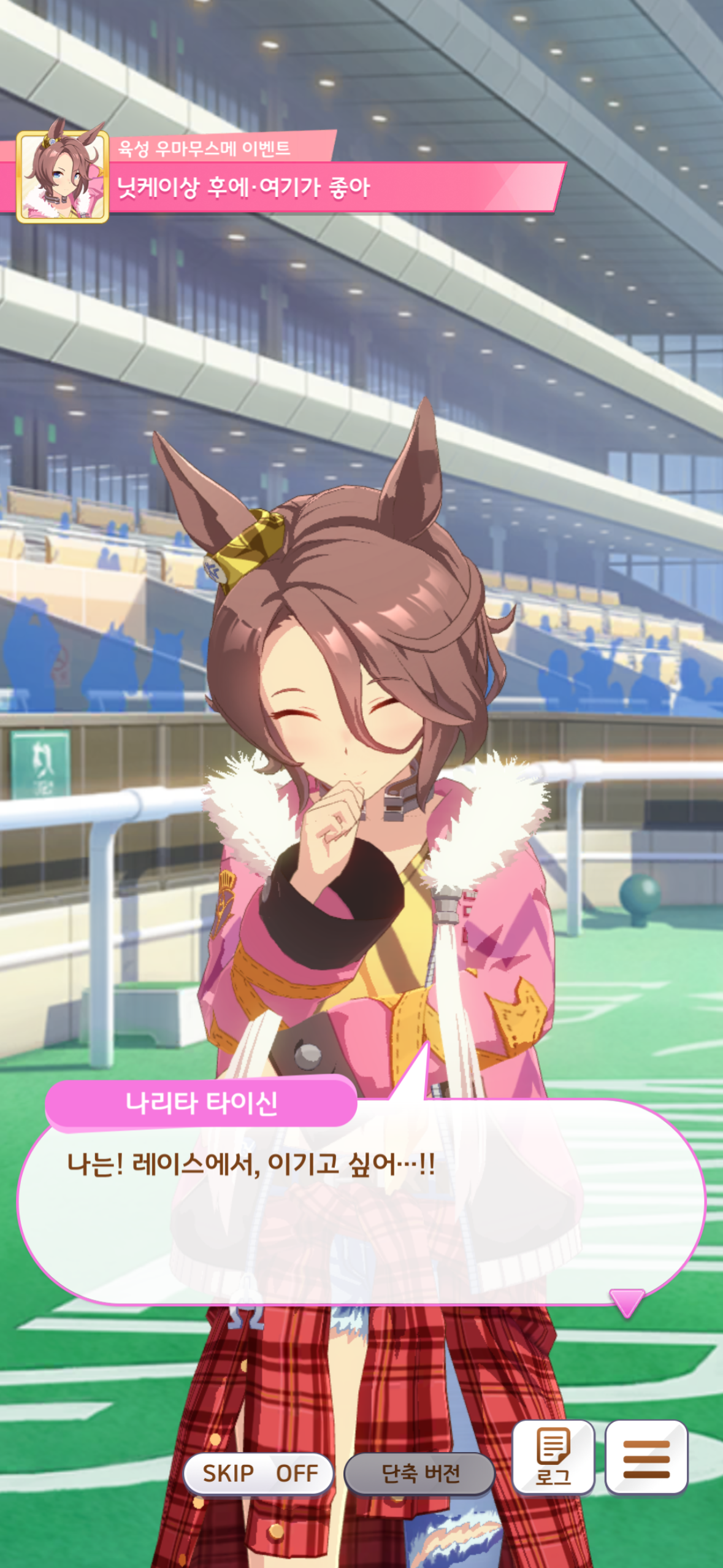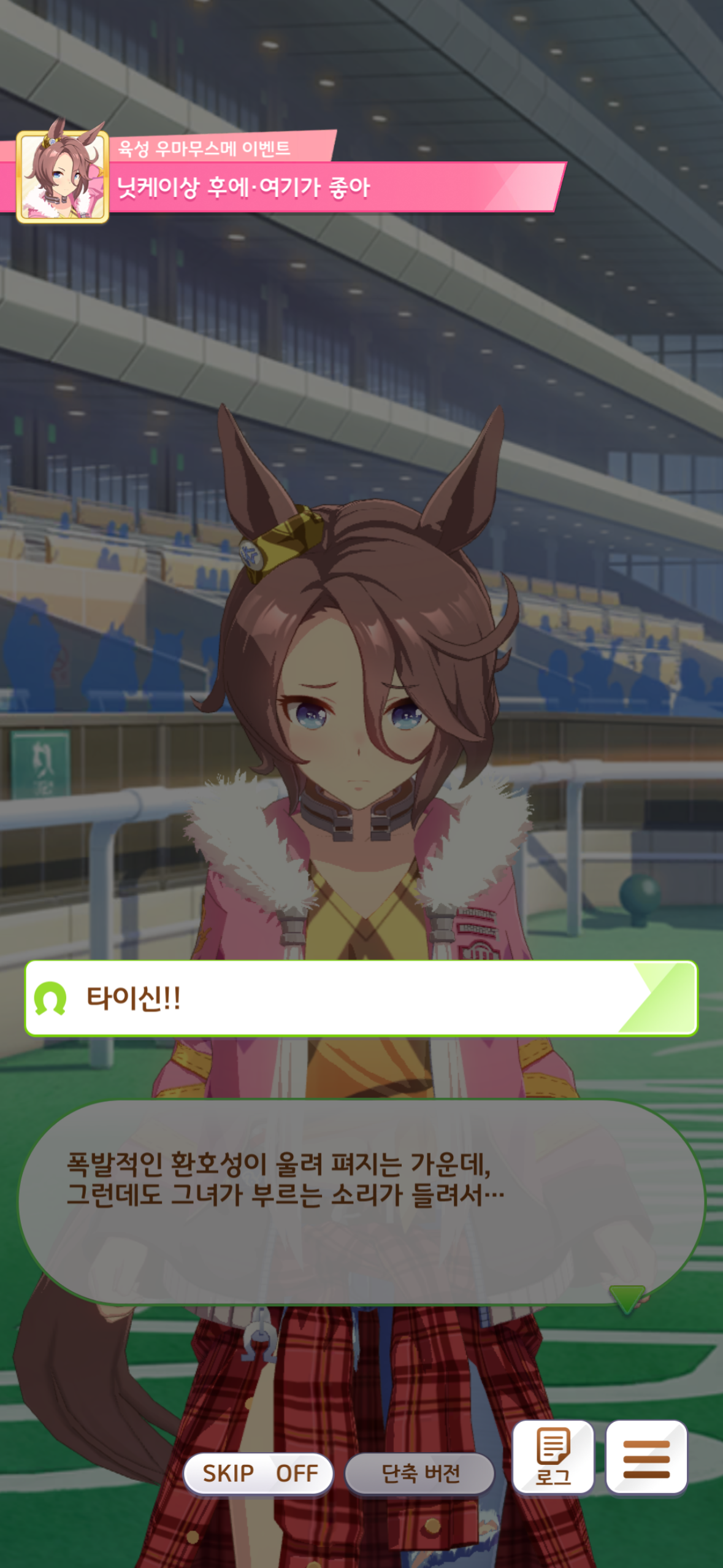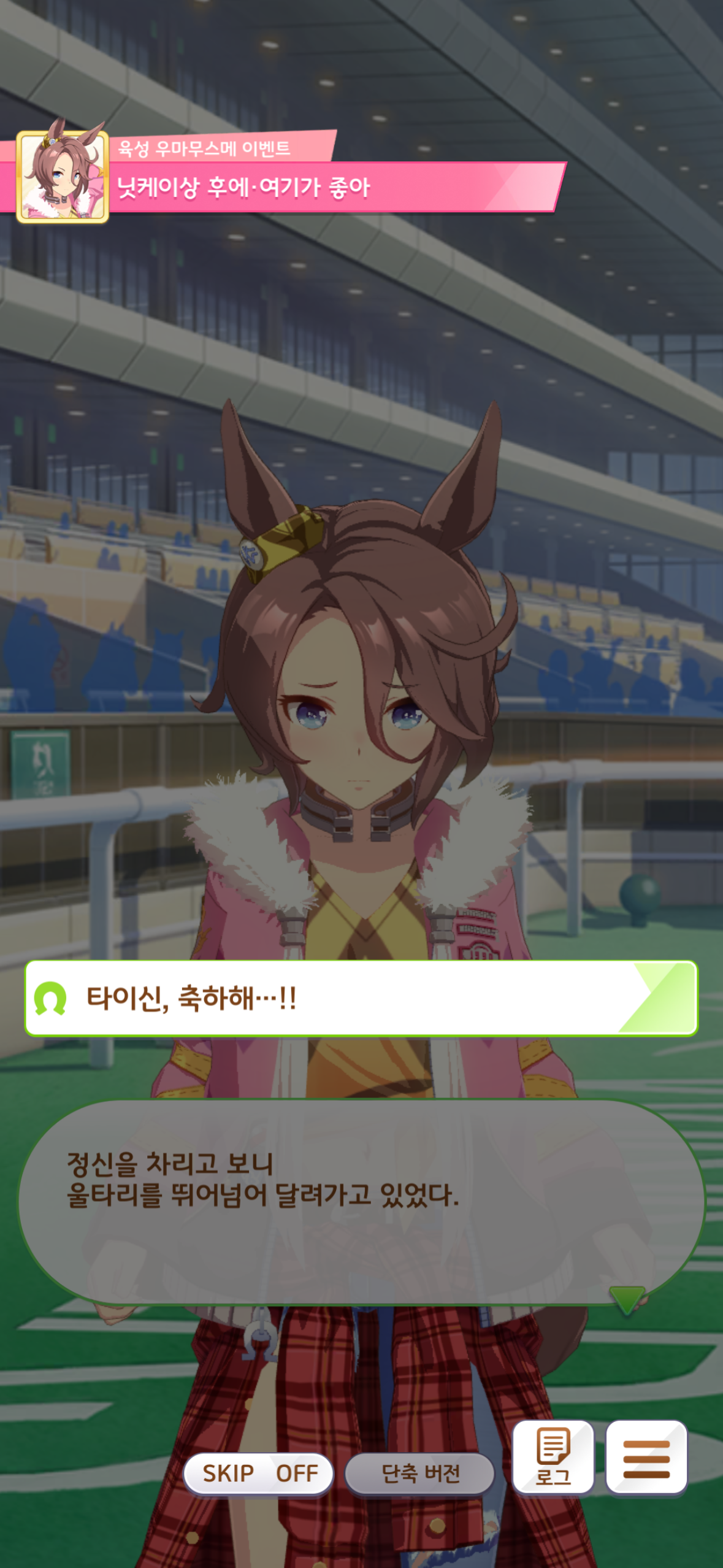 본래 타이신은 자신을 무시하고 깔보던 사람들에게 자신을 다시 보게 해줄 방법은 레이스에서 이기는 것 밖에 없다고 생각했었습니다. 또한 레이스에서 우승하는 것만이 자신의 존재 가치를 증명할 수 있으며, 만약 그렇게 하지 못한다면 본인은 모든 것을 잃게 될 것이라 생각했습니다… 아마도 지금까지 쌓아온 것들이 다 물거품이 되고 본인을 무시했던 사람들에게 아무런 저항도 할 수 없을 것이라 생각한 것이겠죠.(맘찢ㅜㅜ) 그러나 타이신이 본인을 믿지 못하고 불안해하는 만큼 자신이 타이신을 믿겠다, 평생이라도 믿겠다 말해주는 트레이너 덕에 용기를 얻어 닛케이상에 나가게 되었고, 경기에서 우승한 뒤 타이신은 깨닫게 됩니다. 못난 자신의 존재 가치를 느낄 수 있는 곳이 레이스 밖에 없기에 이 곳에서 뛰어야했던 것이 아니라, 사실은 뛰는 것이 즐겁고 우승하는 것이 즐겁기에 이 곳에 있었다는 것을. 너무너무너무너무너무 기특하고 정말 머리를 마구 쓰담아주고 꽉 안아주고 싶은데 차원의 벽 때문에 그럴 수 없다는게 정말 슬프네요… 이거 말고도 좋아하는 이벤트가 정말 많은데 그래도 역시 최고의 순간이 무엇이냐 하면 닛케이상 우승 후인 것 같습니다. 타이신 사랑해!!!!!!!!!!!!!!!!!!!!!!!