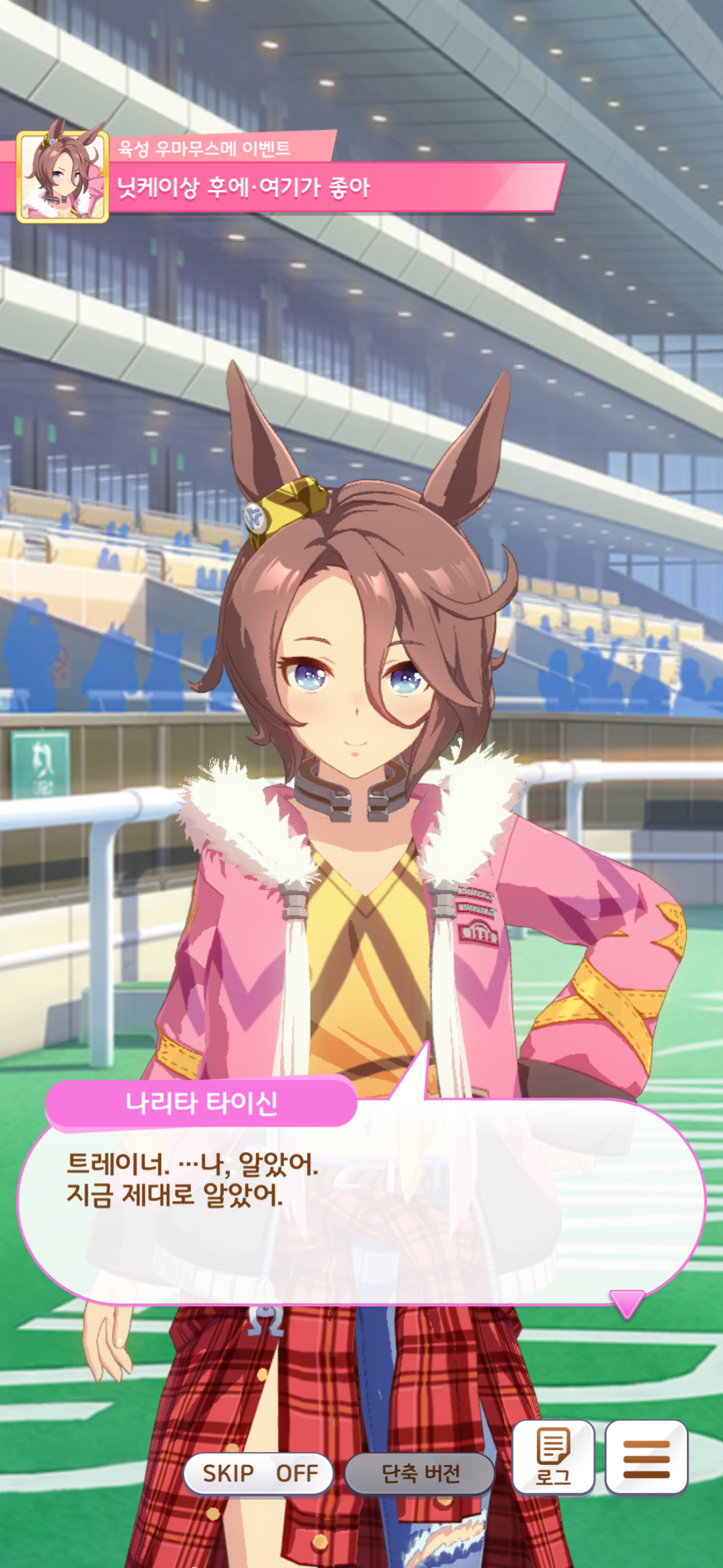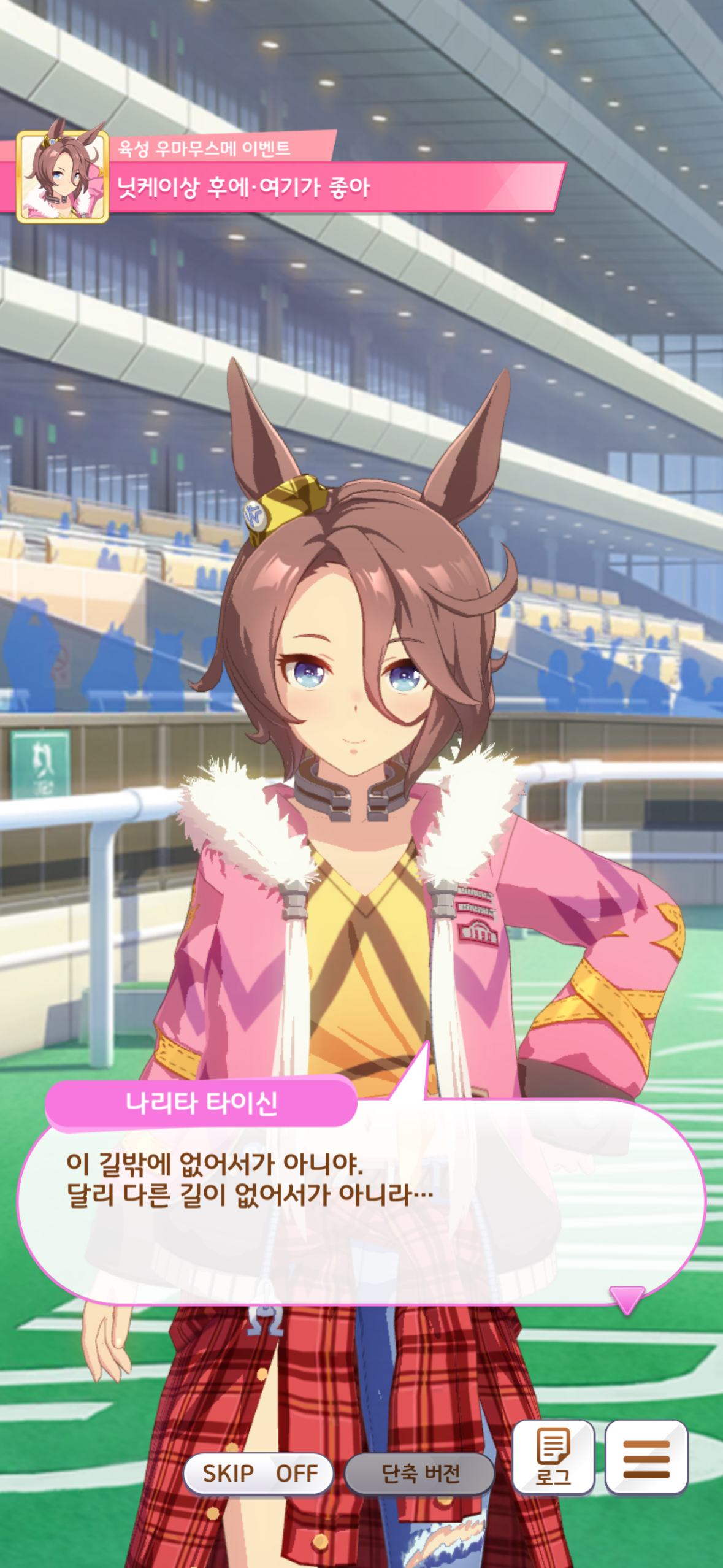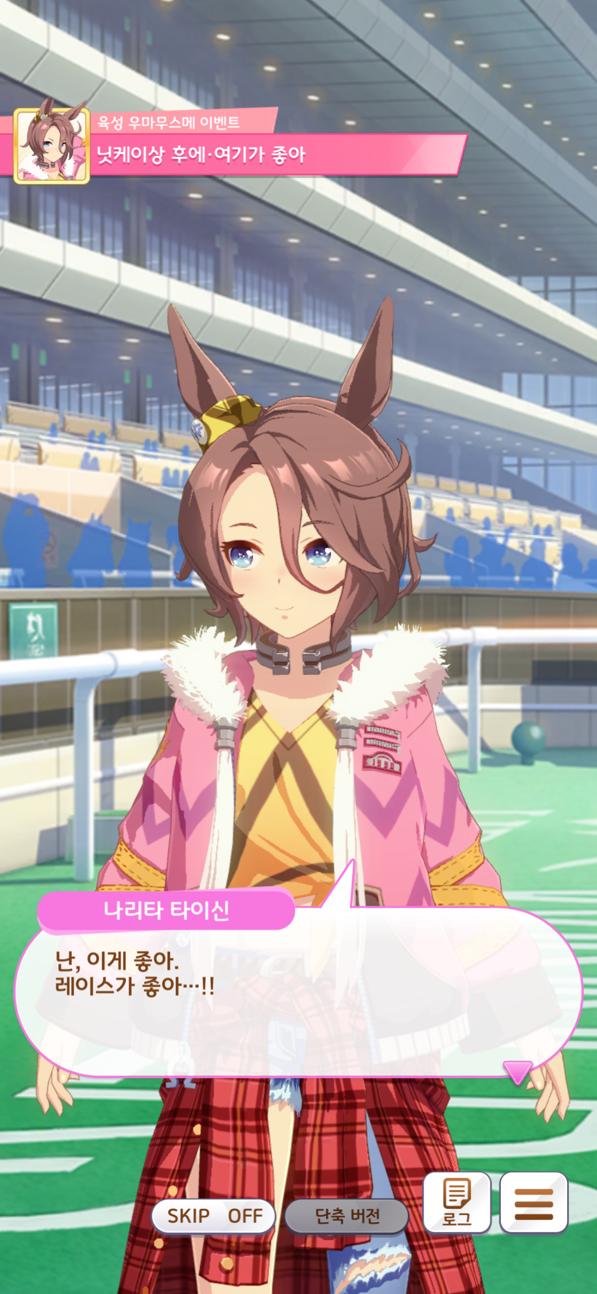 본래 타이신은 자신을 무시하고 깔보던 사람들에게 자신을 다시 보게 해줄 방법은 레이스에서 이기는 것 밖에 없다고 생각했었습니다. 또한 레이스에서 우승하는 것만이 자신의 존재 가치를 증명할 수 있으며, 만약 그렇게 하지 못한다면 본인은 모든 것을 잃게 될 것이라 생각했습니다… 아마도 지금까지 쌓아온 것들이 다 물거품이 되고 본인을 무시했던 사람들에게 아무런 저항도 할 수 없을 것이라 생각한 것이겠죠.(맘찢ㅜㅜ) 그러나 타이신이 본인을 믿지 못하고 불안해하는 만큼 자신이 타이신을 믿겠다, 평생이라도 믿겠다 말해주는 트레이너 덕에 용기를 얻어 닛케이상에 나가게 되었고, 경기에서 우승한 뒤 타이신은 깨닫게 됩니다. 못난 자신의 존재 가치를 느낄 수 있는 곳이 레이스 밖에 없기에 이 곳에서 뛰어야했던 것이 아니라, 사실은 뛰는 것이 즐겁고 우승하는 것이 즐겁기에 이 곳에 있었다는 것을. 너무너무너무너무너무 기특하고 정말 머리를 마구 쓰담아주고 꽉 안아주고 싶은데 차원의 벽 때문에 그럴 수 없다는게 정말 슬프네요… 이거 말고도 좋아하는 이벤트가 정말 많은데 그래도 역시 최고의 순간이 무엇이냐 하면 닛케이상 우승 후인 것 같습니다. 타이신 사랑해!!!!!!!!!!!!!!!!!!!!!!!
