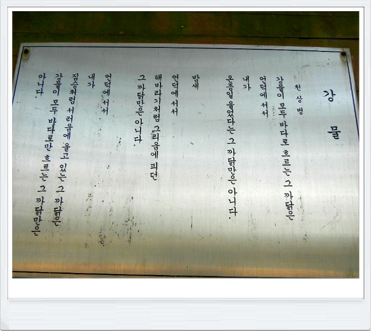 밀양강 수변길에서 읽어보는 천상병시인의 시 <강물>입니다.