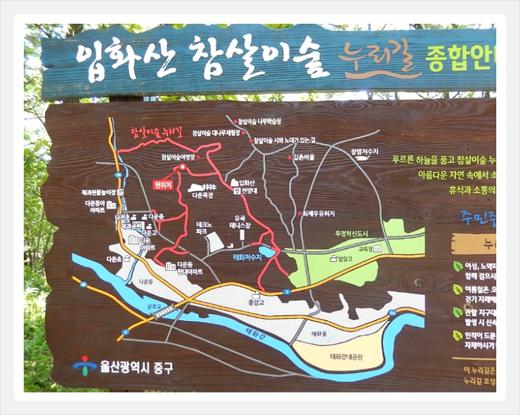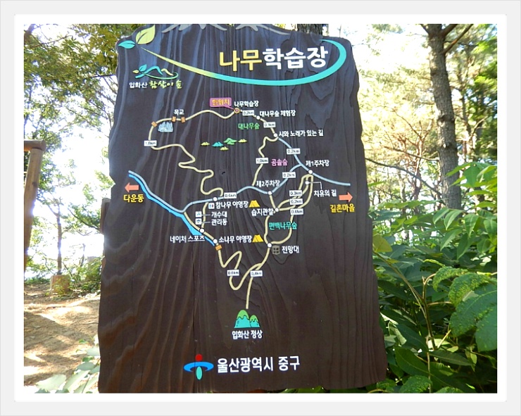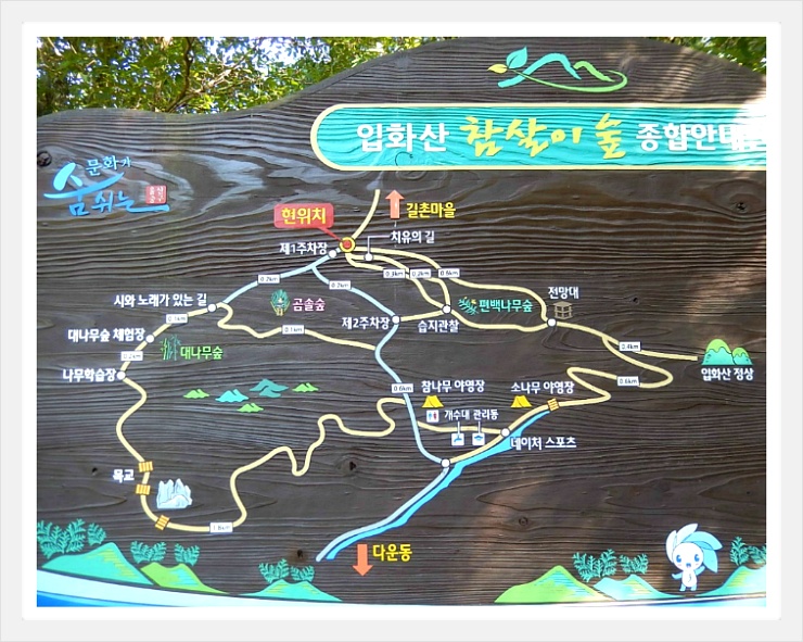 다운목장 상단 쉼터에 있는 <입화산 참살이숲 누리길 종합안내도>