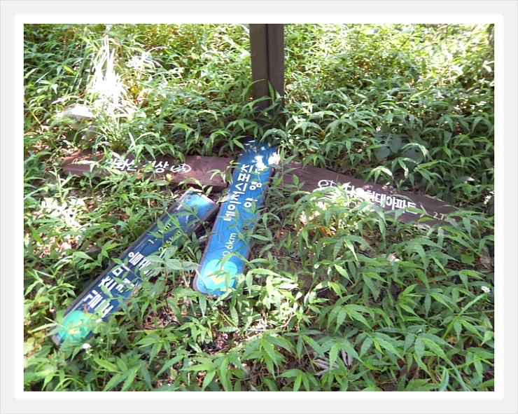 입화산 정상 갈림길 이정표가 훼손되었다.