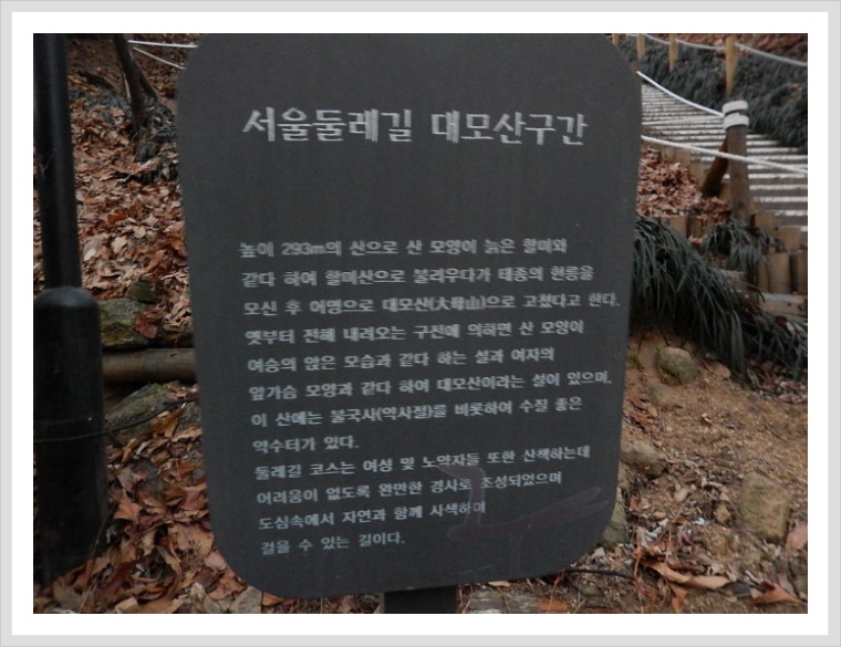 도시철도 수서역 6번출구를 나와서 직진하면 곧바로 서울둘레길 4구간이 시작된다. 대모산구간이다.