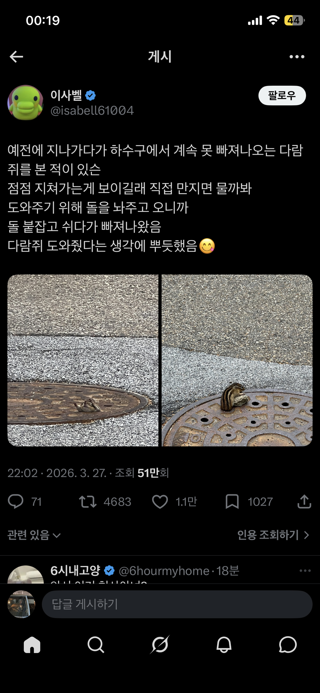 이런 다정함..좋다 작성자_Moon|작성시간26.03.28|조회수53 목록 댓글 4 글자크기 작게가 글자크기 크게가 다음검색 현재 게시글 추가 기능 열기 북마크 공유하기 신고 센터로 신고 댓글 댓글 4 댓글쓰기 답글쓰기 댓글 리스트 작성자죠니 죠스타 | 작성시간 26.03.28 ㅠㅠ 따수워 작성자죄인 | 작성시간 26.03.28 그리고똑똑해...ㅠㅠ 작성자율무 | 작성시간 26.03.28 헐어띃해 돌을 놔둘생각을 햇을가.. 작성자니냐냐 | 작성시간 26.03.28 생명을 살렸다 댓글 전체보기