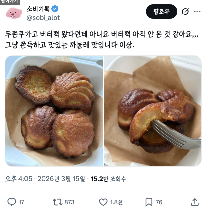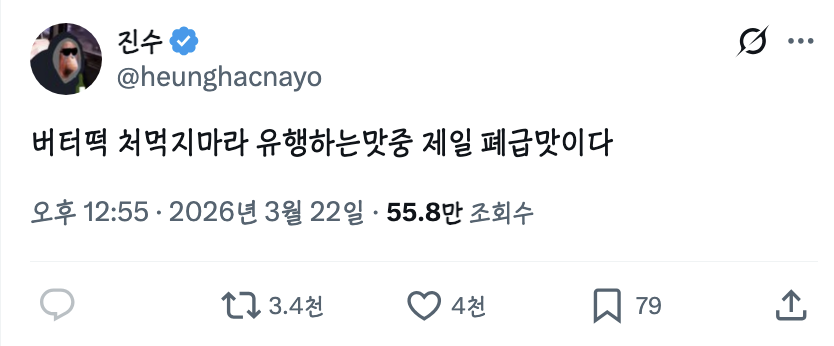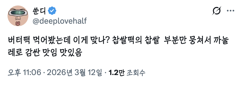[기타]버터떡 유행이다 vs 억유행이다 작성자이누야샤|작성시간26.03.22|조회수447 목록 댓글 25 글자크기 작게가 글자크기 크게가 ㅊㅊ는 사진 누르면 이동 내가 느끼기엔 억유행인데 억유행으로 밈이 된 것 같음 그냥 다음검색 현재 게시글 추가 기능 열기 북마크 공유하기 신고 센터로 신고 댓글 댓글 25 댓글쓰기 답글쓰기 댓글 리스트 작성자소라카 | 작성시간 26.03.22 개인적으로 2같음 그냥 찹쌀도너츠 사먹어 매장마다 너무 다름 작성자적극마인드갖기 | 작성시간 26.03.22 억인데 맛있어 작성자IVE 유진 | 작성시간 26.03.22 억 작성자지은이 | 작성시간 26.03.23 억 작성자픽시 | 작성시간 26.03.23 억인 것 같긴 한데 재료도 간단해서 집에서도 만들 수 있는거라 유행 된것 같기도 해난 집에서 만들어먹으니까 재밌더라ㅋㅋㅋㅋ 찐을 안먹어봐서 제대로 맞는 맛인지는 모르겟음 댓글 전체보기