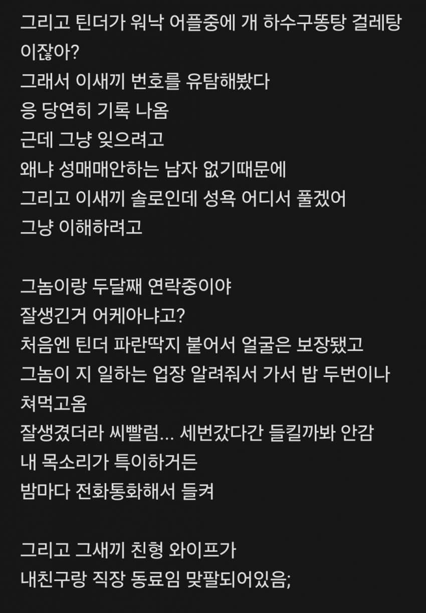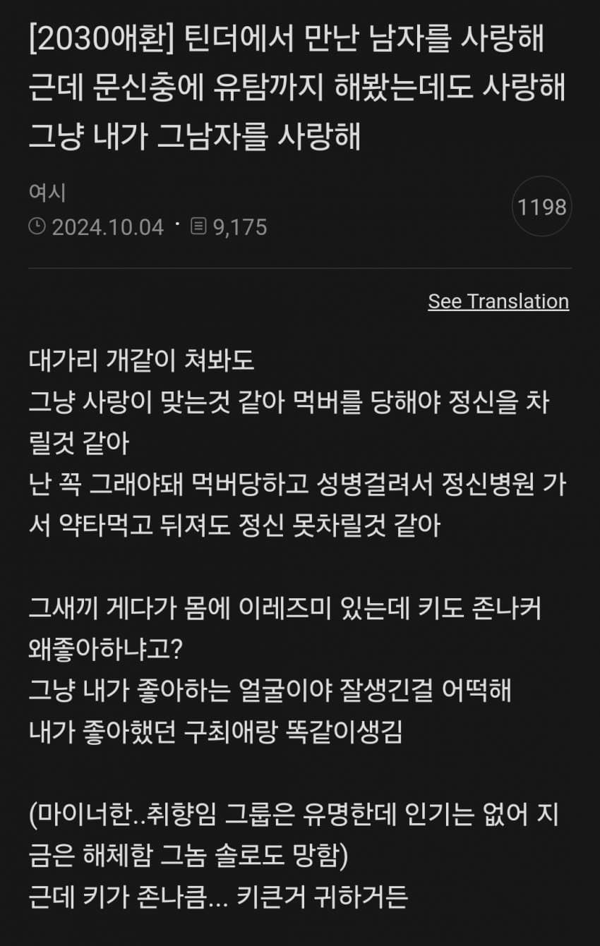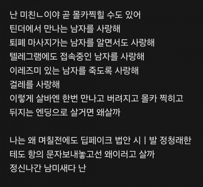 [기타]근데 문신충에 유탐까지 해봤는데도 사랑해 그냥 내가 그남자를 사랑해 작성자이누야샤|작성시간26.03.23|조회수718 목록 댓글 19 글자크기 작게가 글자크기 크게가 https://x.com/nowyeosi/status/2035694972415152535이거 무슨 노래야? 다음검색 현재 게시글 추가 기능 열기 북마크 공유하기 신고 센터로 신고 댓글 댓글 19 댓글쓰기 답글쓰기 댓글 리스트 작성자소소의세상 | 작성시간 26.03.24 병원에 가세요... 작성자꺅둥이 | 작성시간 26.03.24 이것도 자해의 일종 아냐...? 작성자갓생러 | 작성시간 26.03.24 아이고 제발 다른 신경쓰이는 일 생겨서 관심없어지시길... 작성자라일락 | 작성시간 26.03.24 그려 작성자장호중 | 작성시간 26.03.24 ㅉㅉ 댓글 전체보기