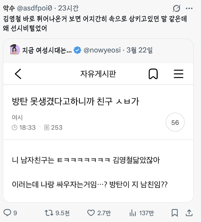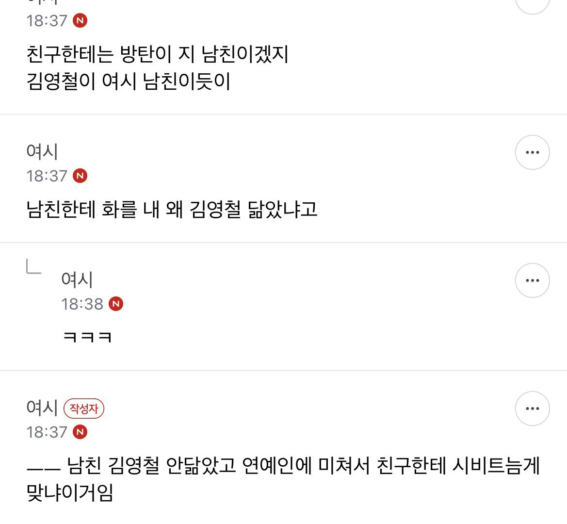 작성자중녀사랑단 작성시간 26.03.24 김영철 닮은 현실한남친 만나면서 남돌 팬 욕하는 건 존나 모순 아니냐고 ㅋㅋㅋㅋㅋㅋㅋㅋ