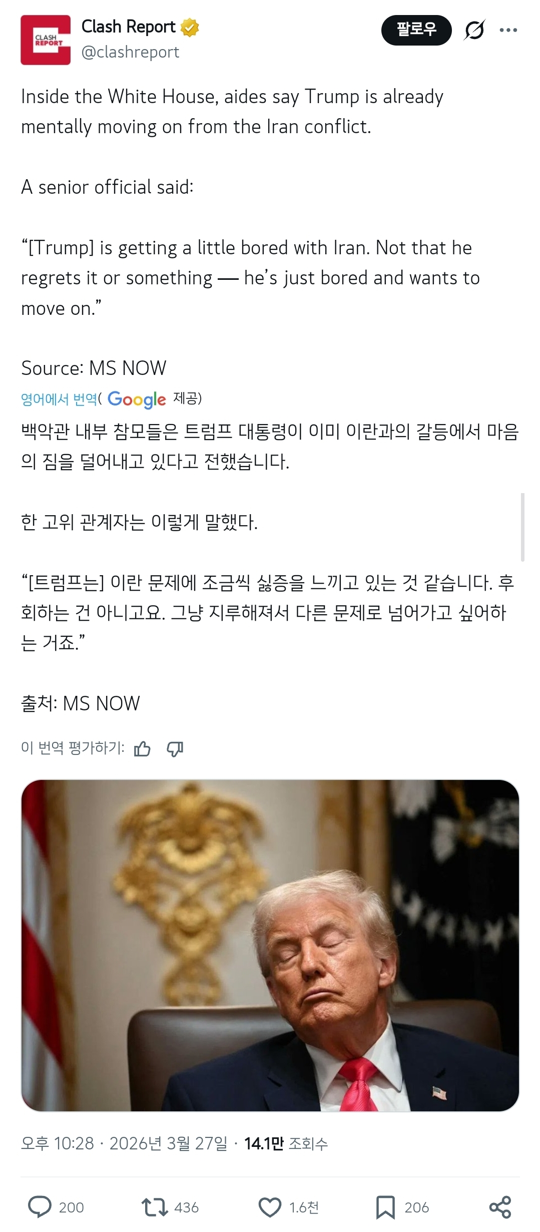 Inside the White House, aides say Trump is already mentally moving on from the Iran conflict. A senior official said: “[Trump] is getting a little bored with Iran. Not that he regrets it or something — he’s just bored and wants to move on.” Source: