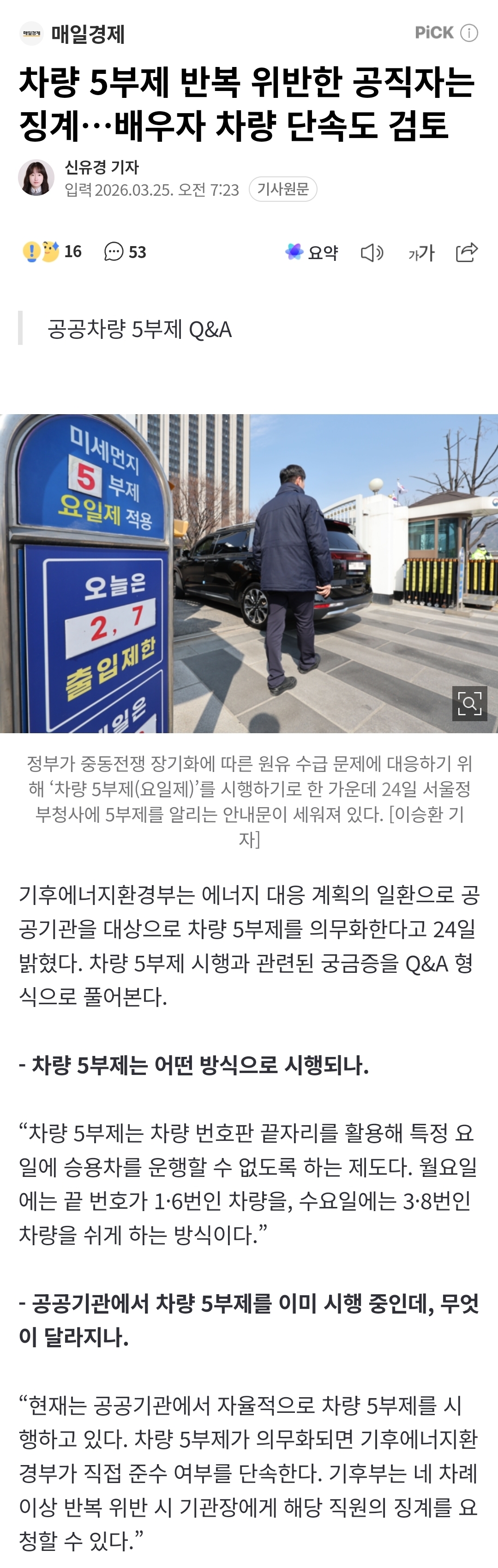 [뉴스]차량 5부제 반복 위반한 공직자는 징계…배우자 차량 단속도 검토 작성자백인호|작성시간26.03.28|조회수302 목록 댓글 14 글자크기 작게가 글자크기 크게가 https://n.news.naver.com/article/009/0005655570?sid=101차량 5부제 반복 위반한 공직자는 징계…배우자 차량 단속도 검토공공차량 5부제 Q&A 기후에너지환경부는 에너지 대응 계획의 일환으로 공공기관을 대상으로 차량 5부제를 의무화한다고 24일 밝혔다. 차량 5부제 시행과 관련된 궁금증을 Q&A 형식으로 풀어본다. -n.news.naver.com 다음검색 현재 게시글 추가 기능 열기 북마크 공유하기 신고 센터로 신고 댓글 댓글 14 댓글쓰기 답글쓰기 댓글 리스트 작성자영서 | 작성시간 26.03.28 ㄹㅇ 차 없으몀 출근 못하는 사람들 많은데 작성자갓생러 | 작성시간 26.03.28 걸어서 1시간을 출근하라고? 버스는 새벽 6시인데? 작성자투우 | 작성시간 26.03.28 댓글 쓴 눈아들 다 공직자인가? 댓글 왜 다 화냄...? 작성자라부 | 작성시간 26.03.28 너무 서울위주야 작성자은지 | 작성시간 26.03.29 공무원 저거 하는데 졸라 ;; 왜 함 15분 거리 1시간 동안 가야 하네 댓글 전체보기