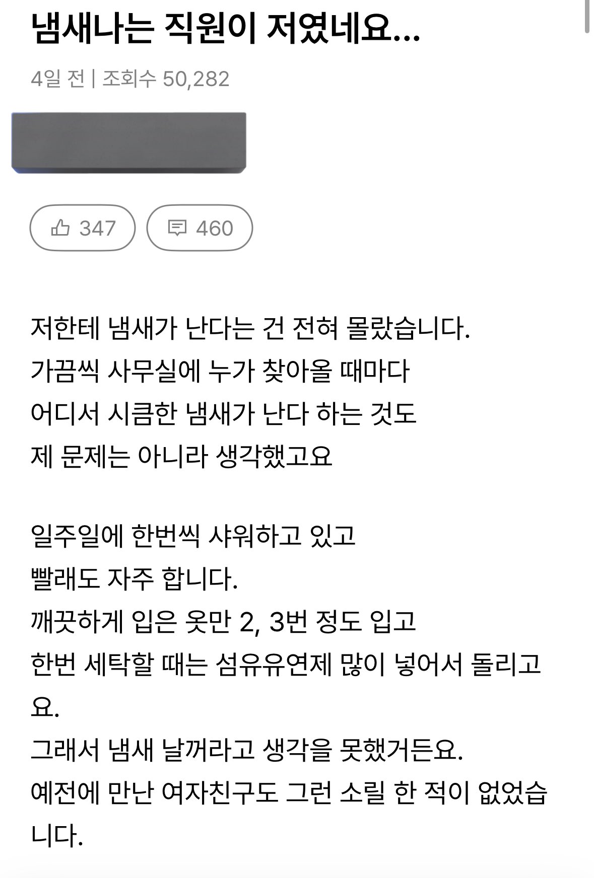 [기타]냄새나는 직원이 저였네요… 작성자복희|작성시간26.04.04|조회수474 목록 댓글 8 글자크기 작게가 글자크기 크게가 다음검색 현재 게시글 추가 기능 열기 북마크 공유하기 신고 센터로 신고 댓글 댓글 8 댓글쓰기 답글쓰기 댓글 리스트 작성자이누야샤 | 작성시간 26.04.04 어????? 작성자로바스찬 | 작성시간 26.04.04 내가 쟬 식초물에 담궜다 뺐다 하다가 바디워시에 마무리로 헹굼탈수버튼 누르고 헹궈도 과연 냄새가 날지 실험해보고 싶다 작성자너나잘해라 | 작성시간 26.04.04 ??? 작성자아침햇살 | 작성시간 26.04.04 ...? 작성자웨더 리포트 | 작성시간 26.04.05 섬유유연제 많이 넣어 돌린다는것도 한숨 나옴 냄새+향기=악취 댓글 전체보기