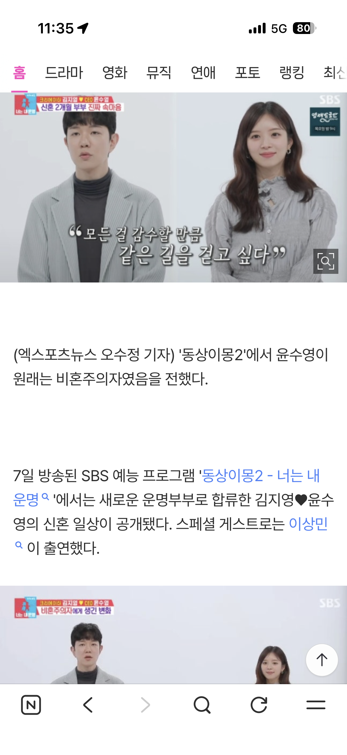 [뉴스]윤수영 "원래는 비혼주의...♥김지영과 결혼 신기해" 작성자쟈니|작성시간26.04.08|조회수9,542 목록 댓글 23 글자크기 작게가 글자크기 크게가 https://m.entertain.naver.com/home/article/311/0001996191 다음검색 현재 게시글 추가 기능 열기 북마크 공유하기 신고 센터로 신고 댓글 댓글 23 댓글쓰기 답글쓰기 댓글 리스트 작성자STACY 재이 | 작성시간 26.04.08 나도 지영눈아랑 살고싶어요. 작성자선물푸 | 작성시간 26.04.08 짜증난다 진짜당신은 비혼이 아니었습니다 작성자Rocky | 작성시간 26.04.08 늘 얘기하지만 님들은 걍 미혼이었던거임 비혼이 아니고 작성자여보세요 | 작성시간 26.04.08 그게 ㅅㅂ 결망생이에요 뭔 비혼 드립 작성자뭐지요 | 작성시간 26.04.08 그냥 미혼이었던거라니까? 댓글 전체보기