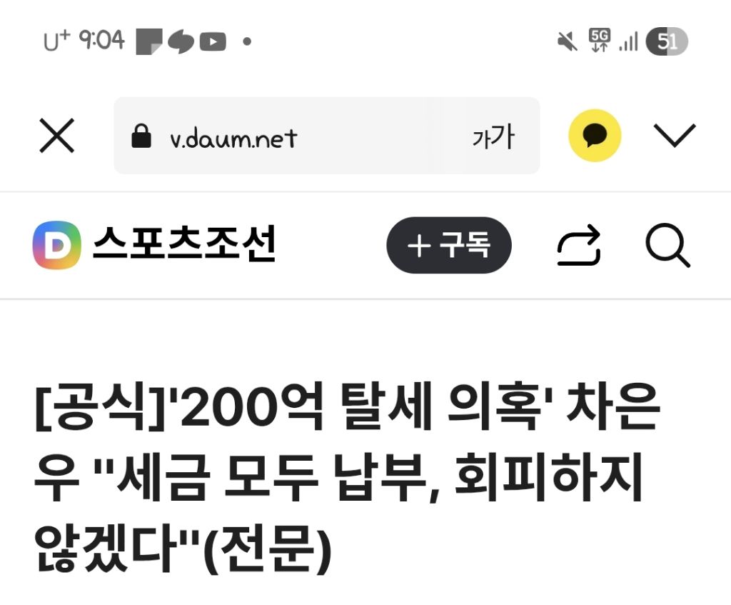 [뉴스]차은우 세금 납부 작성자마요|작성시간26.04.08|조회수1,518 목록 댓글 34 글자크기 작게가 글자크기 크게가 https://v.daum.net/v/20260408205647665[공식]'200억 탈세 의혹' 차은우 "세금 모두 납부, 회피하지 않겠다"(전문)[스포츠조선 김소희 기자]가수 겸 배우 차은우가 납세 논란과 관련해 재차 고개를 숙였다. 차은우는 8일 자신의 SNS를 통해 "최근 저와 관련된 납세 논란으로 팬분들을 비롯한 많은 분들께 실망과v.daum.net아..넵.. 다음검색 현재 게시글 추가 기능 열기 북마크 공유하기 신고 센터로 신고 댓글 댓글 34 댓글쓰기 답글쓰기 댓글 리스트 작성자이ㅈH명 | 작성시간 26.04.08 당연한걸 무슨 작성자택이 | 작성시간 26.04.08 원래 내는거임 작성자미지 | 작성시간 26.04.09 당연한걸 뭔... 작성자이준혁 | 작성시간 26.04.09 안낸 거 들켰다가 뒤늦게 내는 건데 뭐 ㅋ 작성자애인 | 작성시간 26.04.09 ㅎ... 댓글 전체보기