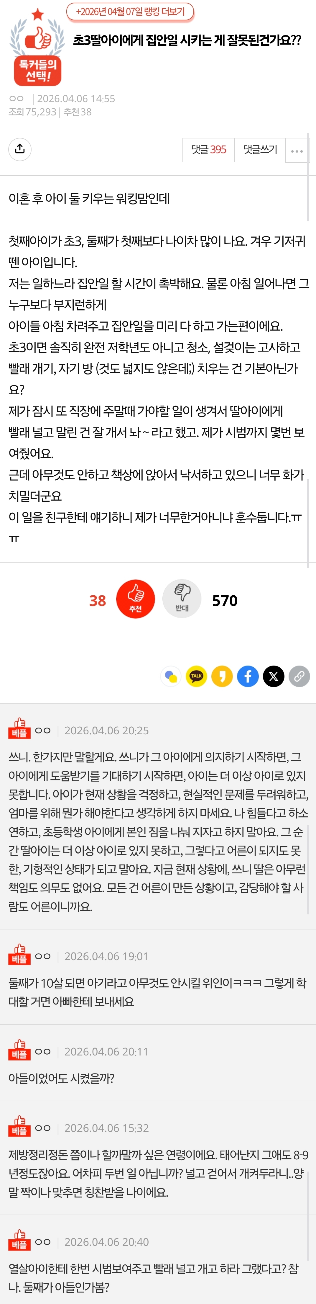 작성자Lacuna 작성시간 26.04.09 자기방 청소는 어렸을때부터 배워야되고 빨래 개기 정도는 할 수 있는 거 같애 각잡아서 이쁘게 접으라는 게 아니잖아