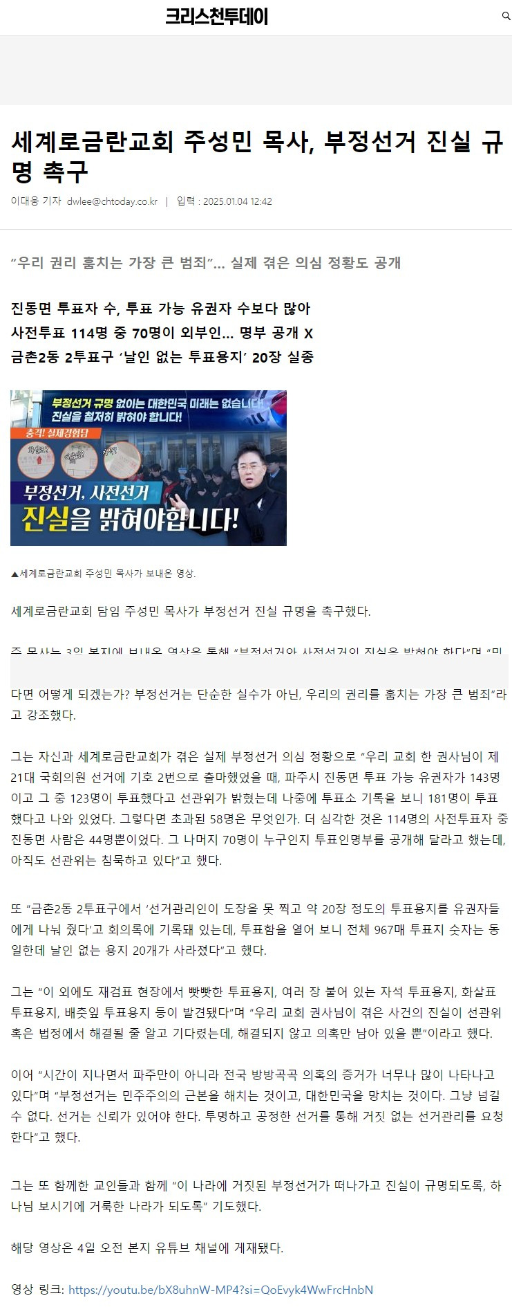 세계로금란교회 주성민 목사, 부정선거 진실 규명 촉구