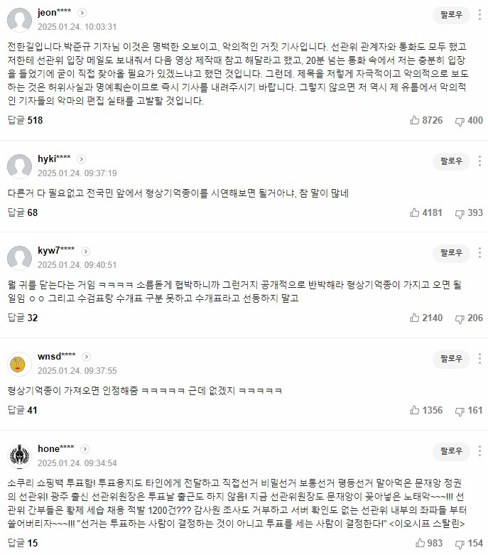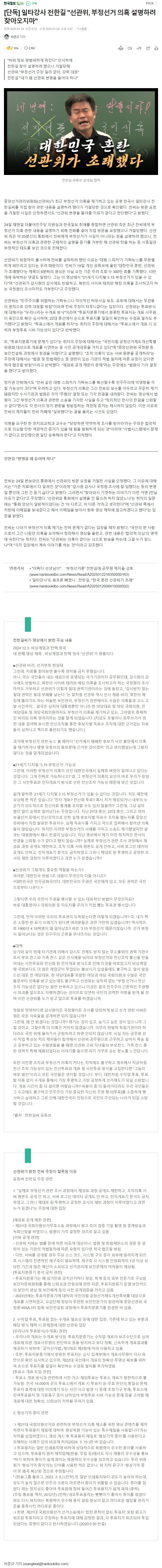 전한길입니다.박준규 기자님 이것은 명백한 오보이고, 악의적인 거짓 기사입니다. 선관위 관계자와 통화도 모두 했고 저한테 선관위 입장 메일도 보내줘서 다음 영상 제작때 참고 해달라고 했고, 20분 넘는 통화 속에서 저는 충분히 입장을 들었기에 굳이 직접 찾아올 필요가 있겠느냐고 했던 것입니다. 그런데. 제목을 저렇게 자극적이고 악의적으로 보도하는 것은 허위사실과 명예훠손이므로 즉시 기사를 내려주시기 바랍니다. 그렇지 않으면 저 역시 제 유툽에서 악의적인 기자들의 악마의 편집 실태를 고발할 것입니다.