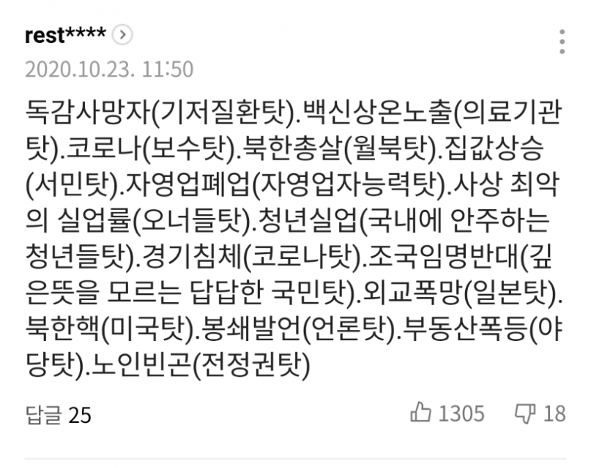 코로나 => 보수우파 탓, 독감백신 사망자 => 기저질환 탓, 백신 상온 노출 => 의료기관 탓, 연평도 공무원 피살 => 월북 탓, 집값 상승 => 주부 젊은층 탓, 자영업자 폐업 => 자영업자 능력 탓, 사상 최악의 실업률 => 기업인 탓, 청년실업률 => 국내만 선호하는 청년들 탓, 경기침체 => 코로나 탓, 조국 임명 반대 => 문재인 속마음 모르는 국민 탓, 외교 왕따 => 일본 탓, 북한 핵 => 미국 탓, 봉쇄 발언 => 언론 탓, 부동산과 전셋값 폭등 => 야당 탓, 노인 빈곤 => 전 정권 탓,