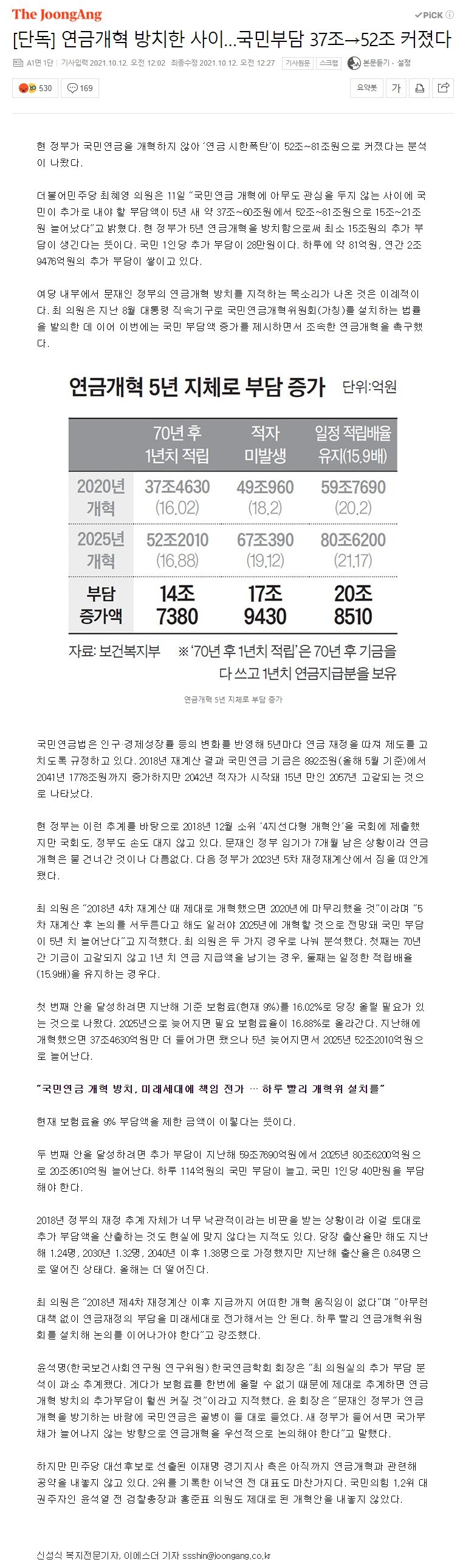 [단독] 연금개혁 방치한 사이…국민부담 37조→52조 커졌다
