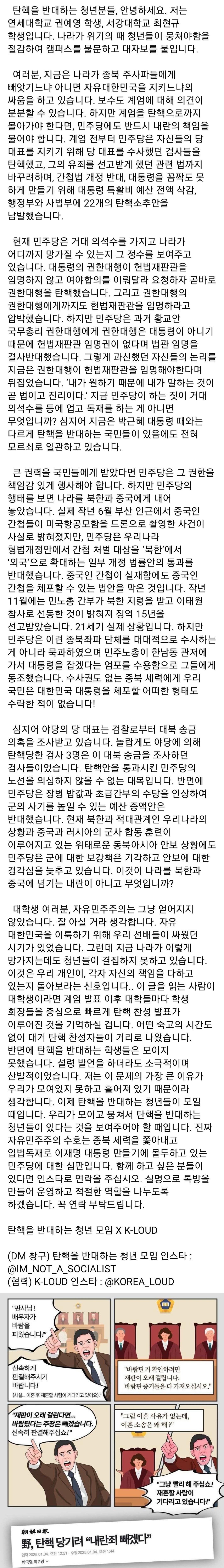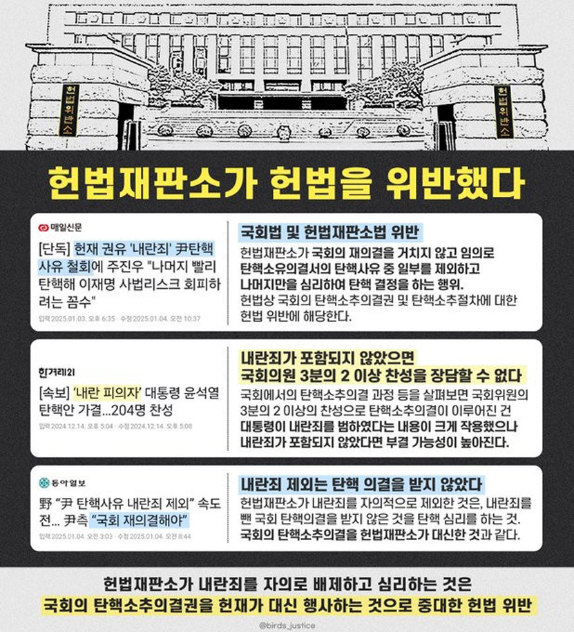탄핵을 반대하는 연세대 서강대생의 글 작성자마스크맨|작성시간25.01.05|조회수44 목록 댓글 0 글자크기 작게가 글자크기 크게가 ☞ 헌법재판소가 내란죄를 자의적으로 배제하고 심리하는 것은 국회의 탄핵소추 의결권을 헌재가 대신 행사하는 것으로 중대한 헌법 위반 다음검색 현재 게시글 추가 기능 열기 북마크 공유하기 신고 센터로 신고 댓글 댓글 0 댓글쓰기 답글쓰기 댓글 리스트