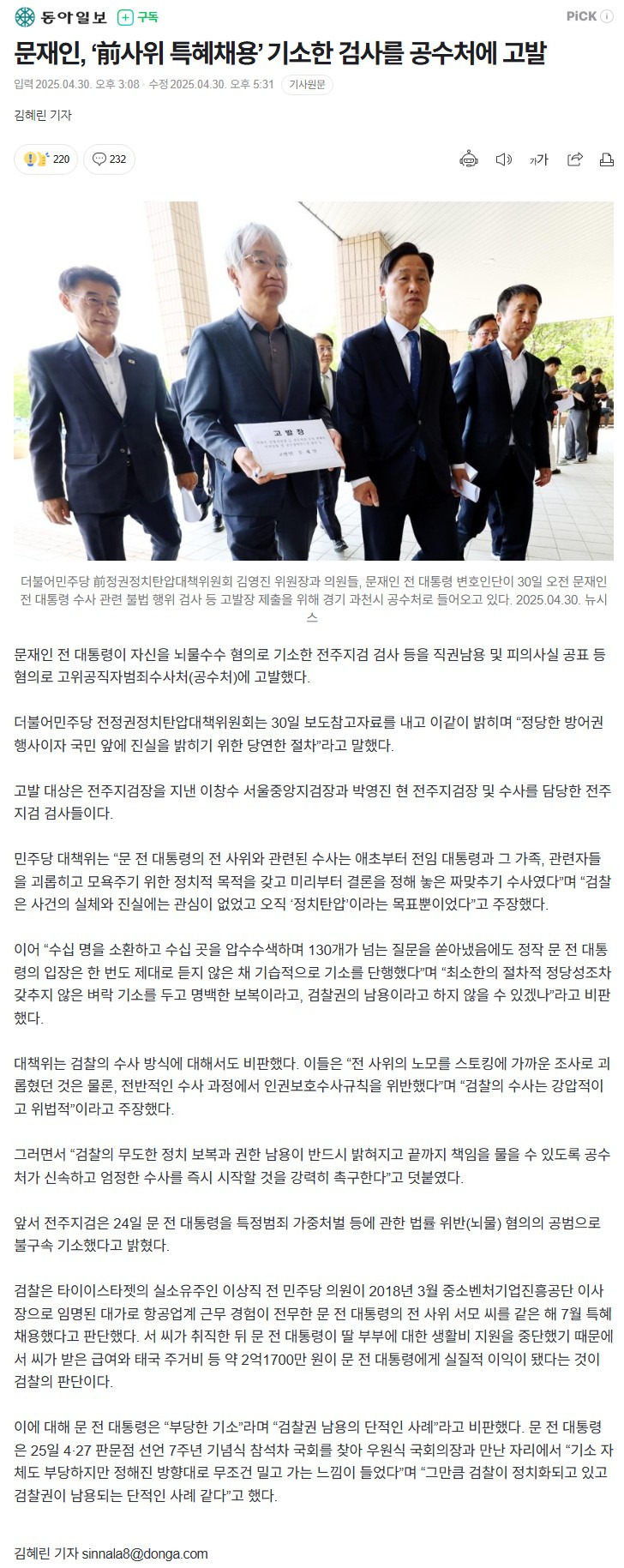 문재인, ‘前사위 특혜채용’ 기소한 검사를 공수처에 고발 작성자마스크맨|작성시간25.05.01|조회수41 목록 댓글 0 글자크기 작게가 글자크기 크게가 문재인, ‘前사위 특혜채용’ 기소한 검사를 공수처에 고발 https://n.news.naver.com/mnews/article/020/0003632149 다음검색 현재 게시글 추가 기능 열기 북마크 공유하기 신고 센터로 신고 댓글 댓글 0 댓글쓰기 답글쓰기 댓글 리스트