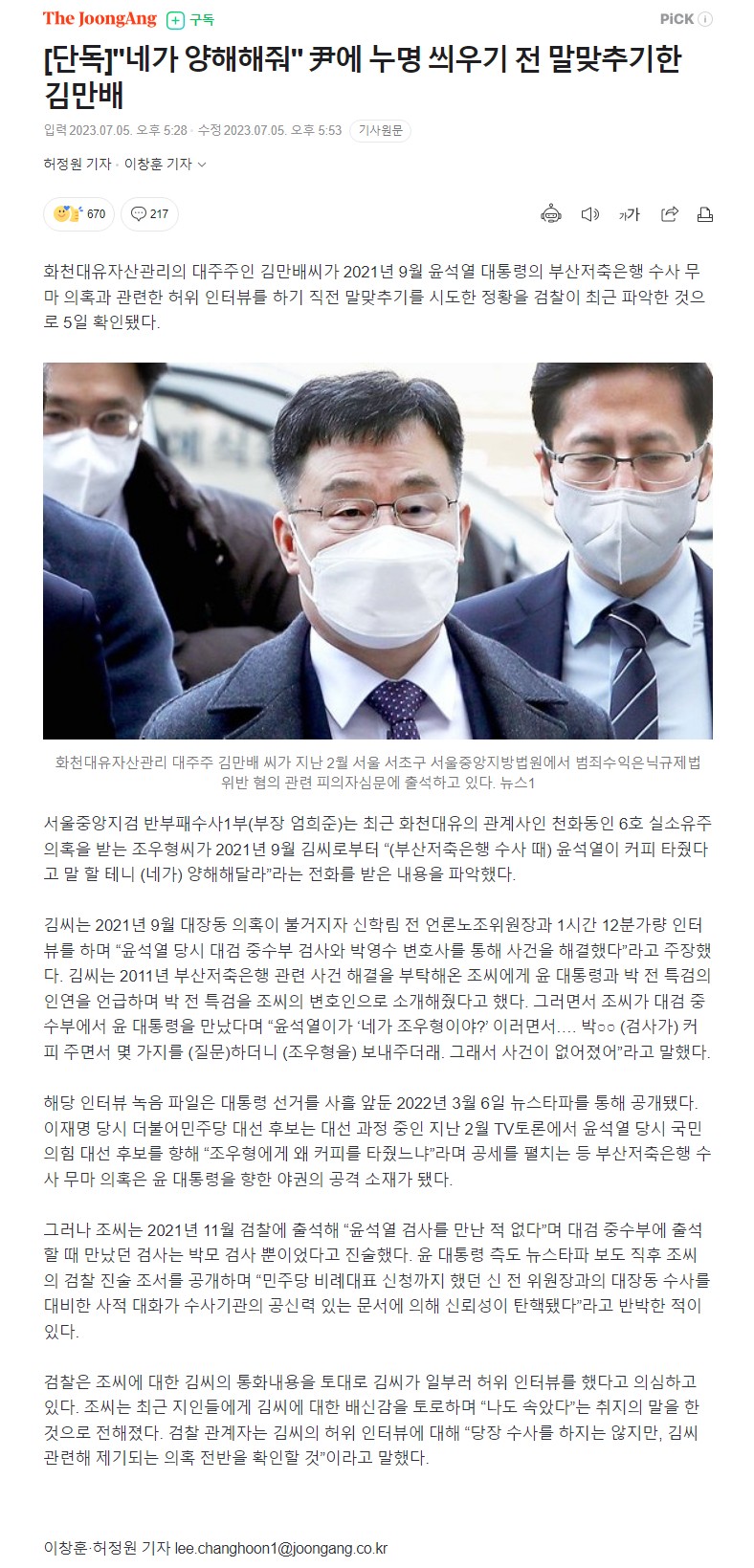 "네가 양해해줘" 尹에 누명 씌우기 전 말맞추기한 김만배 작성자마스크맨|작성시간23.07.05|조회수57 목록 댓글 0 글자크기 작게가 글자크기 크게가 "네가 양해해줘" 尹에 누명 씌우기 전 말맞추기한 김만배 https://n.news.naver.com/mnews/article/025/0003291739 다음검색 현재 게시글 추가 기능 열기 북마크 공유하기 신고 센터로 신고 댓글 댓글 0 댓글쓰기 답글쓰기 댓글 리스트