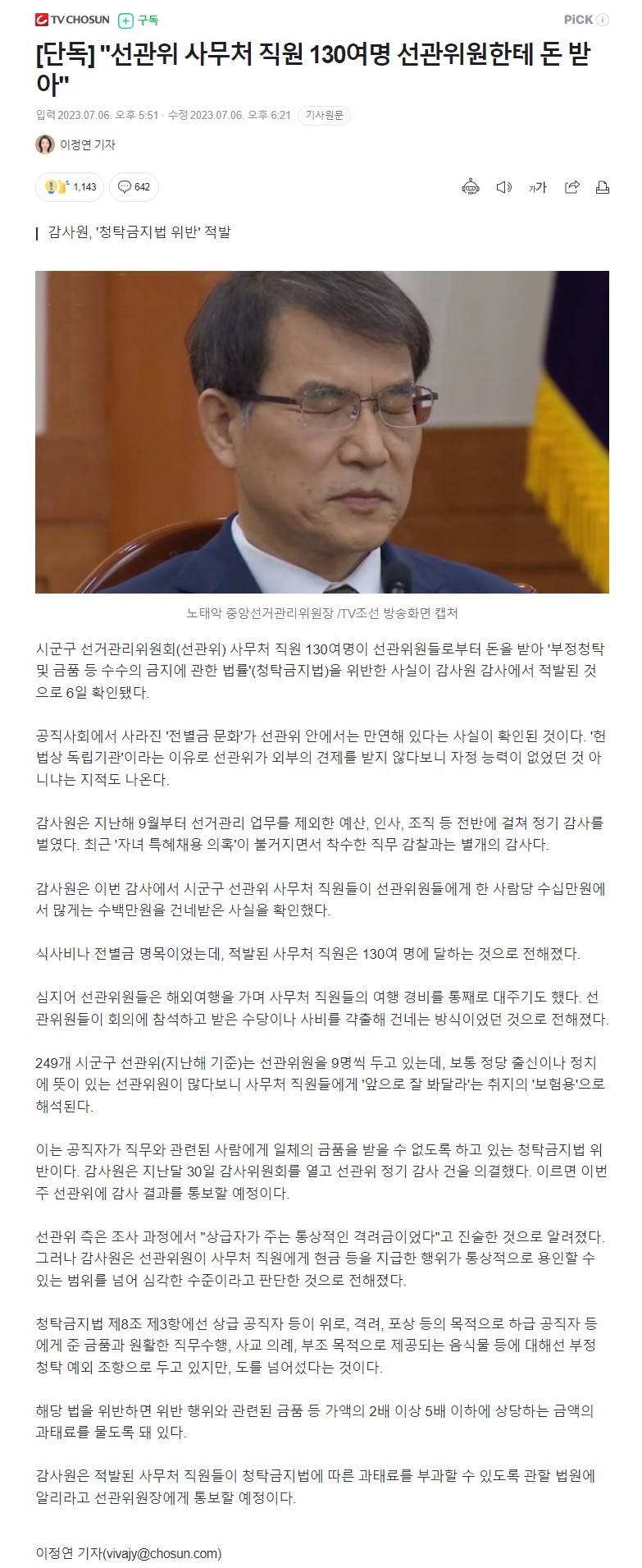 선관위 사무처 직원 130여명 선관위원한테 돈 받아