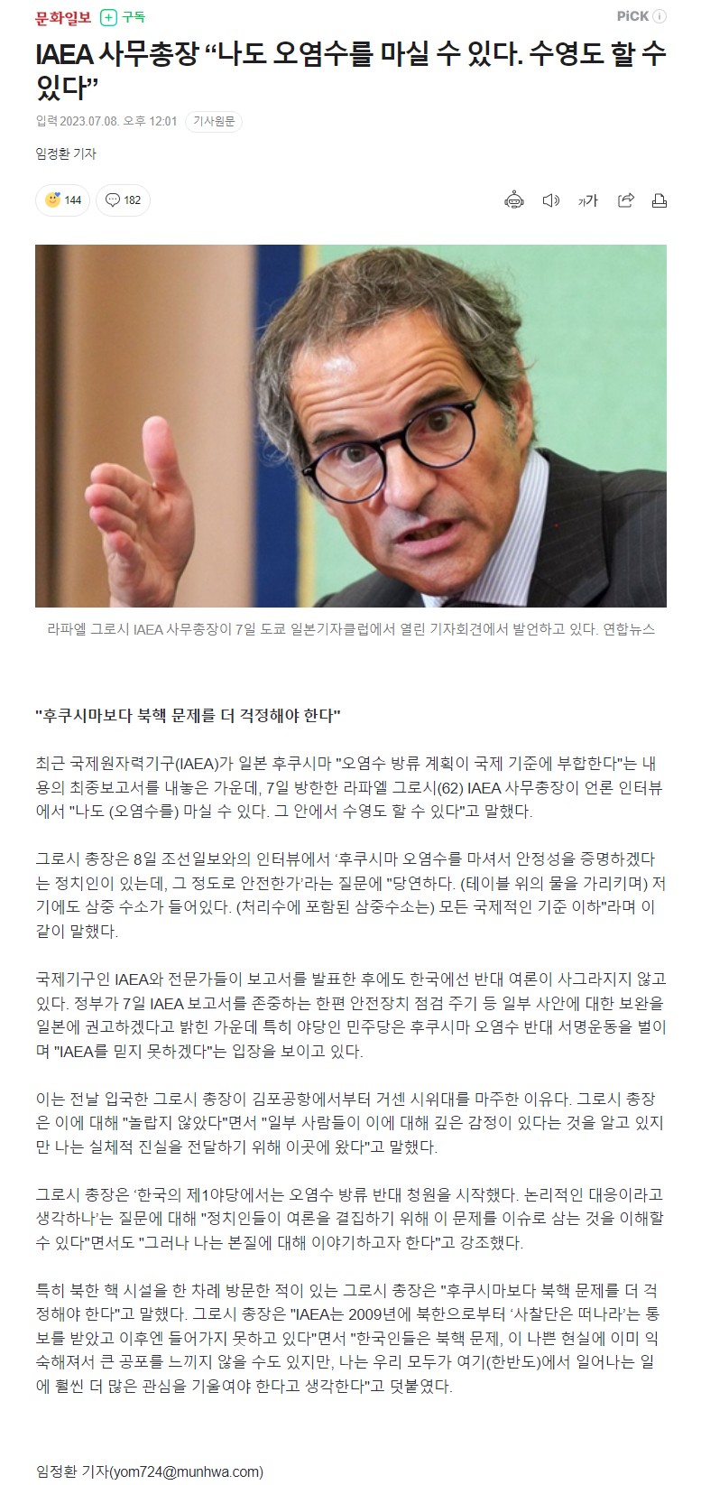 IAEA 사무총장 “나도 오염수를 마실 수 있다. 수영도 할 수 있다”