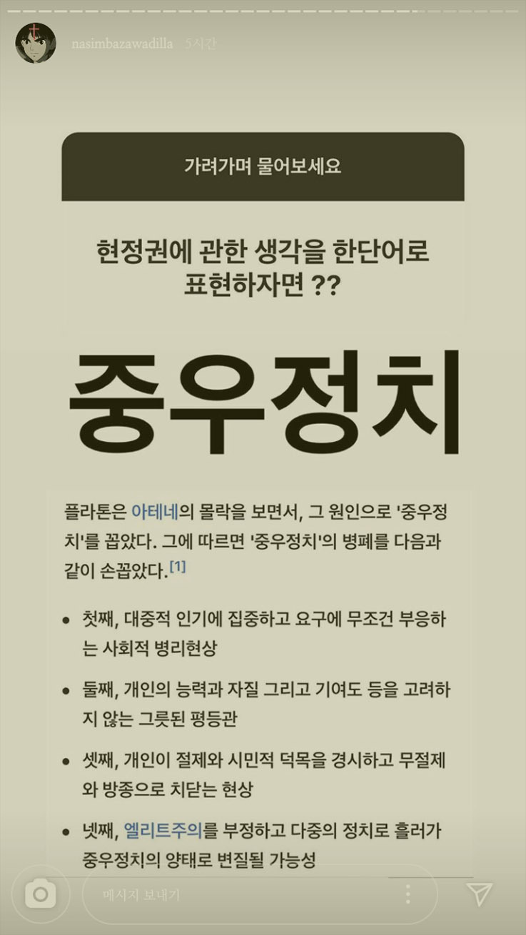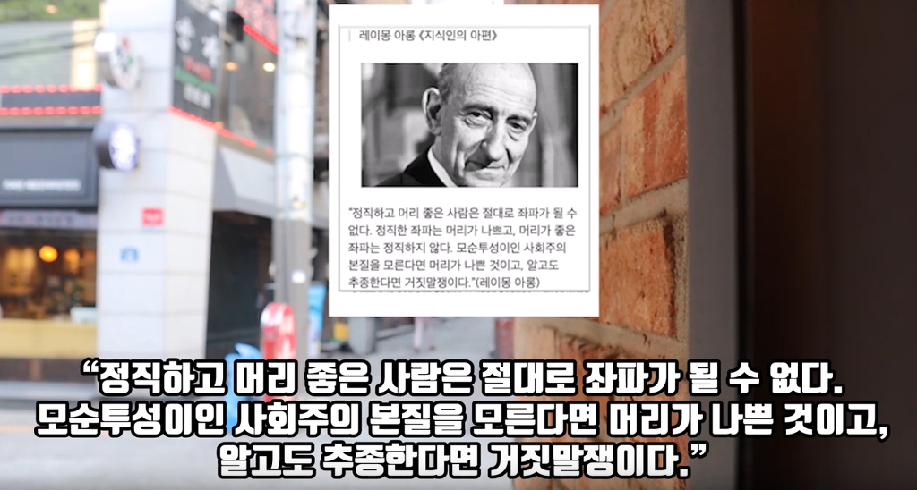 “정직하고 머리 좋은 사람은 절대로 좌파가 될 수 없다. 정직한 좌파는 머리가 나쁘고 머리가 좋은 좌파는 정직하지 않다. 모순투성이인 사회주의 본질을 모른다면 머리가 나쁜 것이고 알고도 추종한다면 거짓말쟁이다”