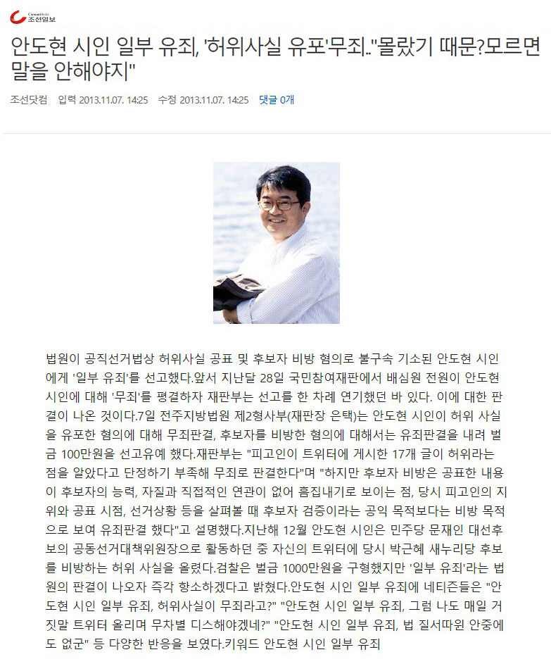 안도현 시인 일부 유죄, ‘허위사실 유포’무죄…"몰랐기 때문?모르면 말을 안해야지!"
