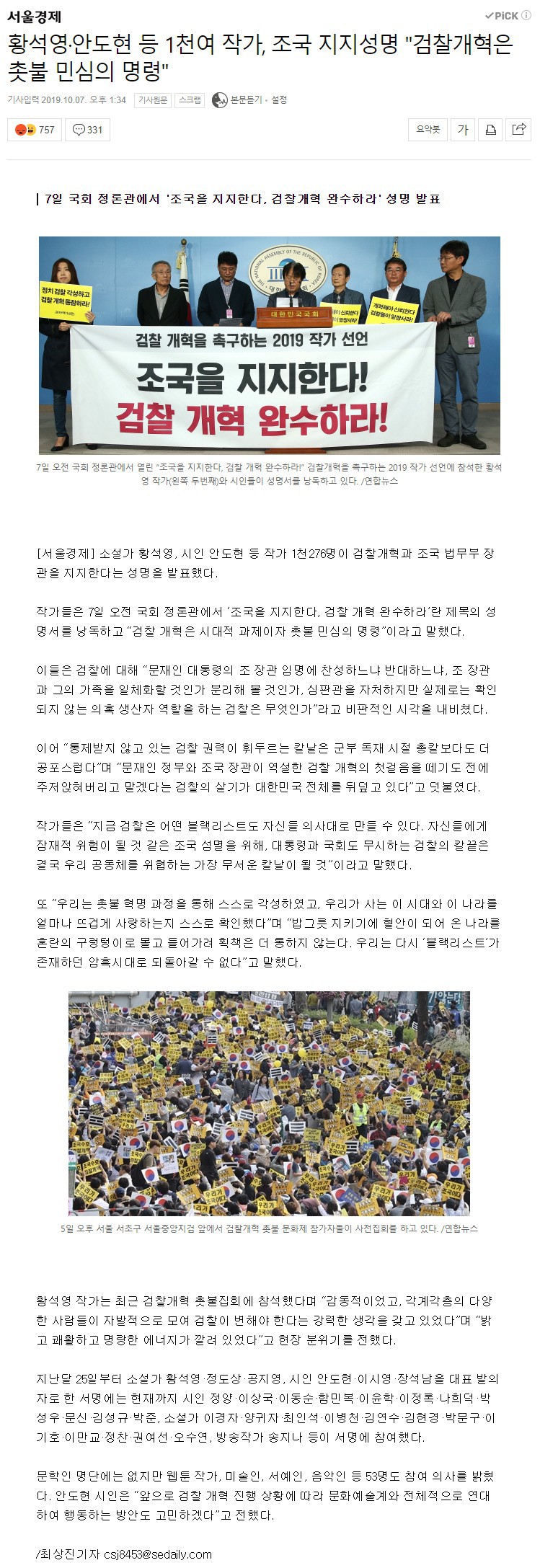황석영·안도현 등 1천여 작가, 조국 지지성명 "검찰개혁은 촛불 민심의 명령"