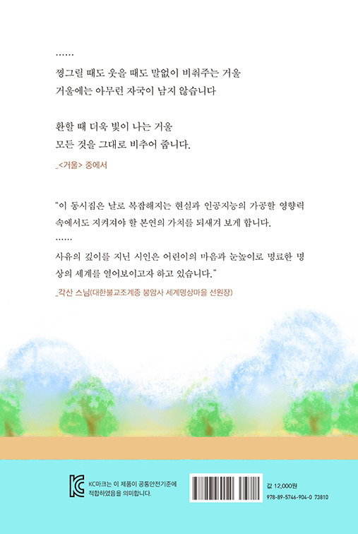 “명상은 단지 조용히 앉아 있는 행위가 아니라, 자신과 삶을 올바르고 깊이 있게 바라보는 힘을 기르는 중요한 길입니다. 명상 체험은 어릴 때 접할수록 더욱 값지고 그 가능성은 무한하다고 할 수 있습니다. 때로는 명상 체험을 통해 삶의 방향이 새롭게 바뀔 수 있을 정도로 큰 영향력을 끼칠 수 있습니다. 명상은 일상생활 어디에서나 들어갈 수 있는 열린 길입니다. 이러한 명상길에 시인의 동시들을 음미함으로써 다가갈 수 있게 된다면, 탁월한 체험이 될 수 있습니다. 사유의 깊이를 지닌 시인은 어린이의 마음과 눈높이로 명료한 명상의 세계를 열어 보이고자 하고 있습니다.”