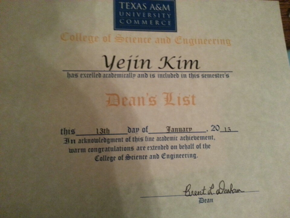 Texas A&M orgo A학점 이수, Dean's award (우등상)