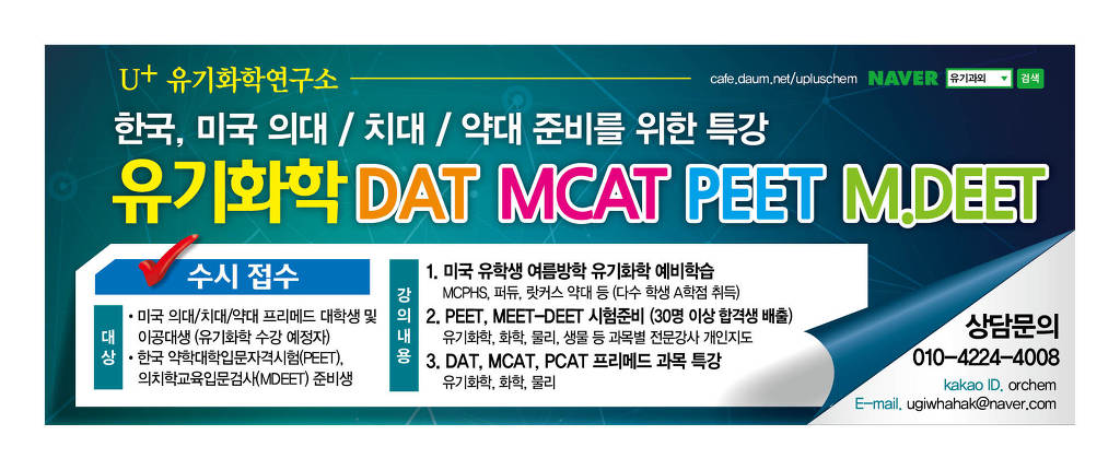 유기화학은 국내 6년제 약대 PEET시험과 의치학전문대학원 진학을 위한 MEET와 DEET시험을 대비하기 위해서 꼭 공부해야 하는 과목이다. PEET시험의 경우, 물리, 화학, 생물, 유기화학 등 4과목이 각각 25%씩 골고루 반영돼 어느 한 과목에서도 실수를 해서는 안 된다. 특히 유기화학은 양이 많은 어려운 과목인 만큼 시험 준비를 하는 학생들의 세심한 대비가 필요하다.