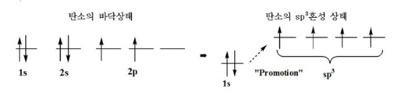 탄소는 2s 전자중의 하나를 빈 2px 궤도함수에 승위“promotion"시키면 4개의 절반이 채워진 궤도함수가 형성되고 네 개의 C-H 결합을 형성 할 수 있다. 즉 탄소의 네 원자가 껍질 궤도함수 (2s,2px,2py,2pz)가 서로 혼합(혼성,hybridization)되어 에너지가 같은 네 개의 절반 채워진 궤도함수를 형성하는 것이다. 네 개의 새로운 궤도함수를 sp3 혼성궤도함수(sp3 hybrid orbitals)이라한다. 그 이유는 궤도함수 중 한 개는 s궤도함수로부터 유래하고 세 개는 p 궤도함수로부터 유래하기 때문이다. 이때의 결합은 C(2sp3)—H(1s) σ 결합이다.