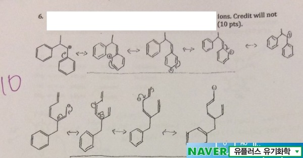 가능한 모든 공명구조 기여체들을 그리고 굽은화살표도 점수에 가감한다는 문제입니다.