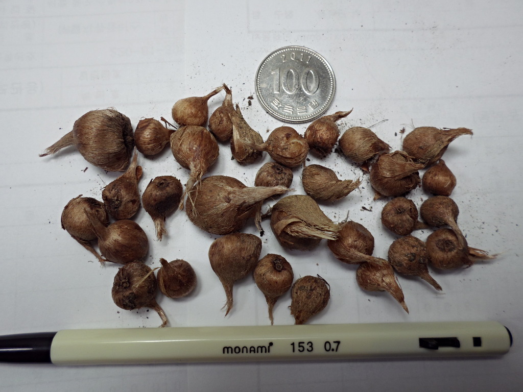 구근은 납작한 구형, 구근의 크기는 직경이 약 3~4cm 내외이며,