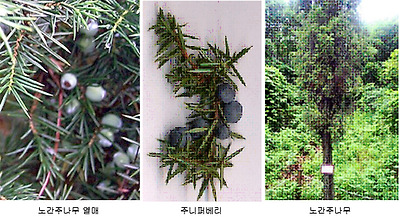 노간주나무(Juniperus rigida)는 예전부터 소의 코뚜레 재료로 사용되는가 하면 열매는 약재로 이용되어 왔다. 건조하고 척박한 산지에 생육하며 바늘잎을 가진 작은 키의 나무로 6m정도까지 자라며 암수가 다른 나무로 가늘고 긴 원추형의 나무모양이 특징적이다. 열매는 콩알만한 크기로 꽃이 핀지 1년이 지난 다음 해의 10월에 검은색으로 성숙된다. 노간주나무의 종류에는 서울노간주(var. seoulensis), 평강노간주(var. modesta), 바닷가에서 자라는 해변노간주(var. koreana)등이 있으나 그리 큰 차이는 없으며, 열매의 활용가치가 더욱 큰 나무라 할 수 있다. 향나무와 노간주나무의 학명 주니퍼(Juniper)에서 알 수 있듯이 서양산 주니퍼(Juniperus communis)와 유사한 품종이다. 주니퍼는 제네바(Geneva)에서 유래된 명칭을 지녔다. 와국에서는 주니퍼의 열매 주니퍼베리(Juniper Berries)가 술(진, Gin)의 향료소재로 쓰이고 있다. 노간주나무의 열매를 두송실(杜松實)이라 하여 거의 같은 역할을 하니; 노간주나무의 국제적 관용어(Temple Juniper, Needle Junipe)가 있지만 한국의 주니퍼(Korean Juniper)로 육성시킬 필요성이 있다고 본다. 참고로 고호(Vincent Van Gogh)가 즐겨 그렸던 나무 “사이프레스(Cypresses)”를 측백나무로, 독일의 무서운 그림동화 “주니퍼나무(The Juniper Tree)”를 노간주나무로 국내에서 나름대로 적절히 번역되었지만, 우리가 흔히 알고 있는 우리의 나무이름 그대로 받아들이면 안된다. 서식지에 따라 나무의 느낌이 다를 수 있기 때문이다. 적어도 서식지에 대한 구분과 특징을 나타내는 형용사는 붙여야 할 것(실측백, 서양노간주 등)이며, .전문가 및 학자들의 외래식물에 대한 통일된 표기가 하루 속히 이루어졌으면 하는 입장이다.