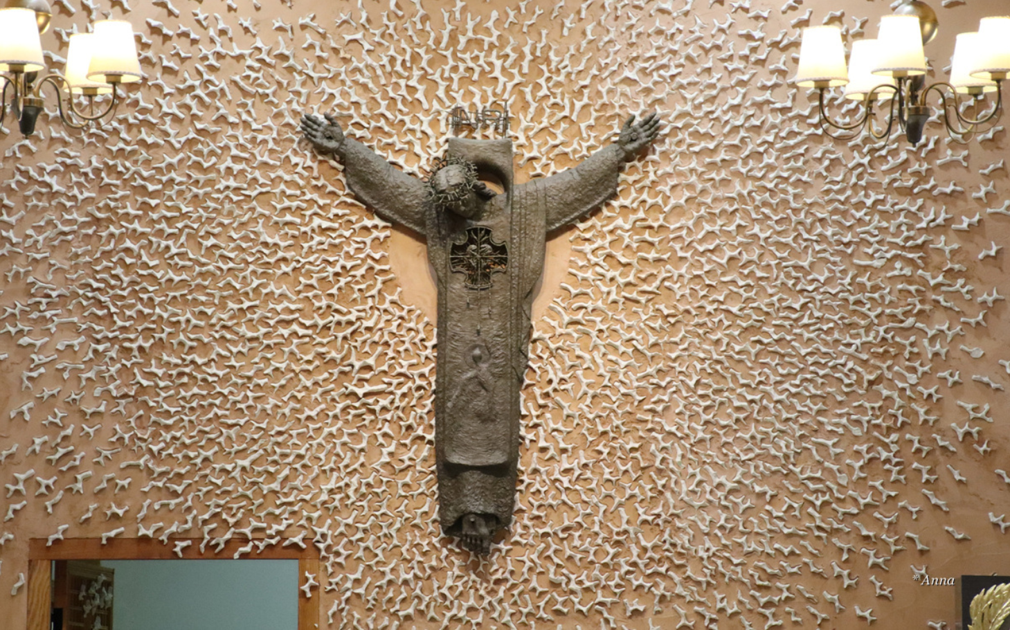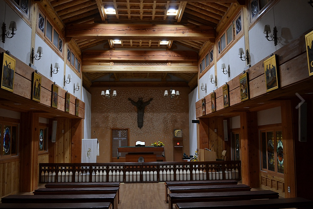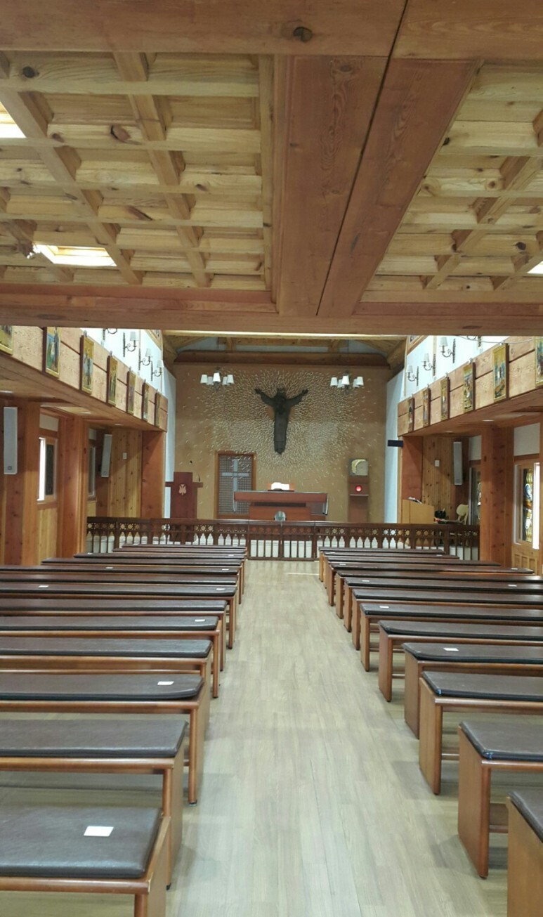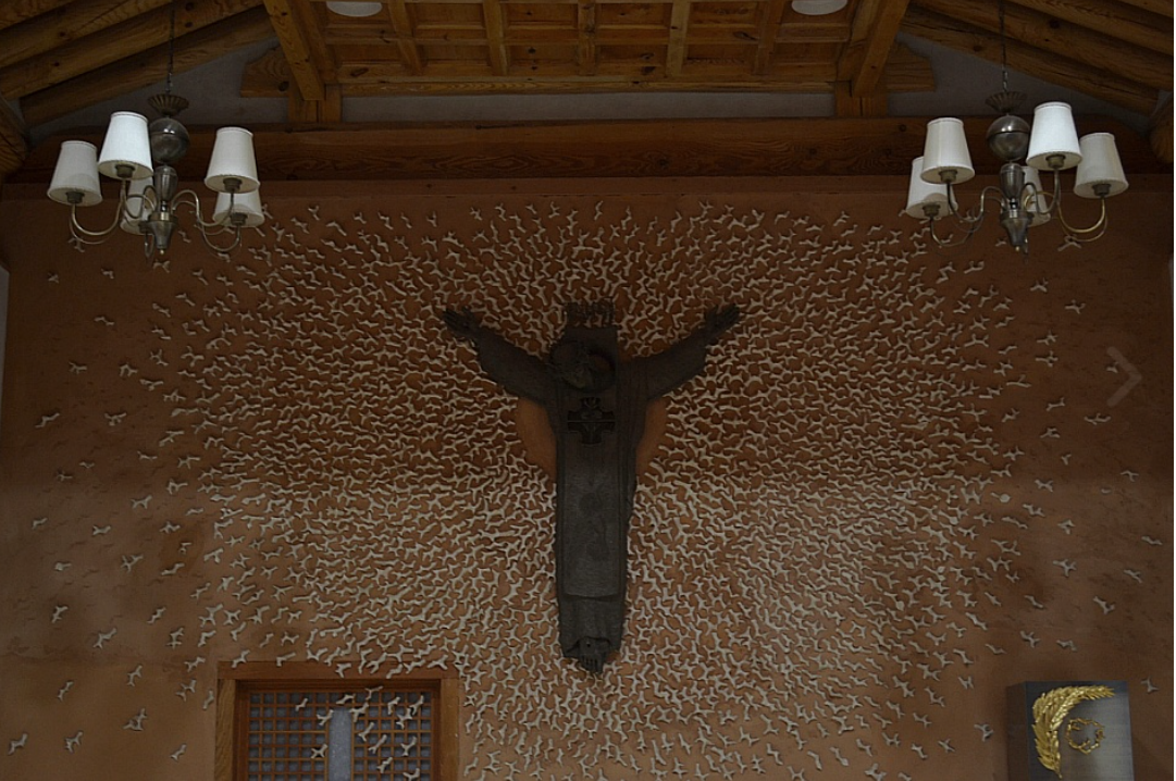 제대 위 십자고상에 달린 예수님은 순교자들처럼 목에 칼을 쓰고 있었다.