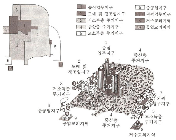CBD, 도매경공업지구, 저급주택지구, 중산층주택지구, 고급주책지구, 중공업지구, 부심, 신주택지구, 신공업지구 | ||
