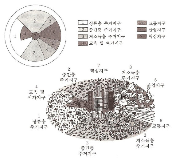 경제학적 입장, 교통노선을 따라 확대, 부채꼴 모양, 상류층의 입지 선택능력이 우선됨 |