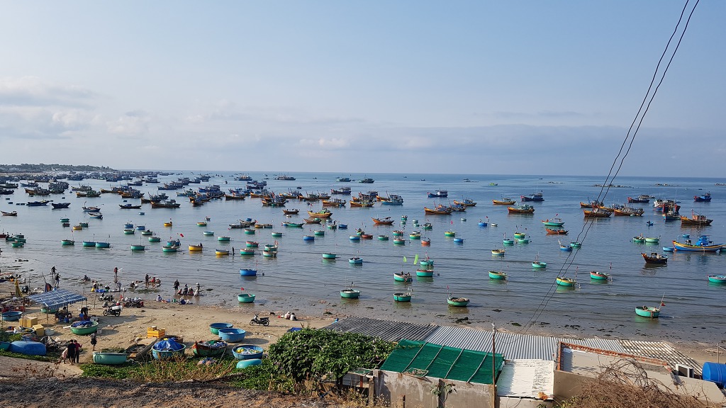 다음 투어는 “Fishing village”라는 곳인데 쉽게 말해서 베트남식 “어촌”이다. 그러나 여러 척의 배들과 바구니 배들이 정박해 있는 풍경은 예사로운 풍경이 아니었고 이곳은 볼 만한 곳이란 생각이 들었다. 어선들이 고기를 잡아오면 이 항구는 수심이 얕기 때문에 직접 들어올 수 없어 바구니 배에 다시 고기를 옮겨 육지까지 운반하는 것이다. 우리는 항구까지 내려가지 않고 사진 몇 장을 찍고 근처 식당에서 진열해 놓은 고기와 조개를 구경하며 “요정의 샘물”로 갈 때를 기다리며 시간을 보냈다. 우리 짚 차 뒤에 특별히 만든 좌석에 앉아 있던 서양 처녀는 치마를 입고 차에서 뛰어 내리다가 어디서 그런 자연스럽고 화려한 기술을 익혔는지 치마가 날려 올라가 엄청나게 크고 뽀얀 히프와 오늘 아침 갈아입은 하얀 팬티를 보여주었다. 다음 행선지인 “요정의 샘물”에서도 또 뛰어 내리겠지.