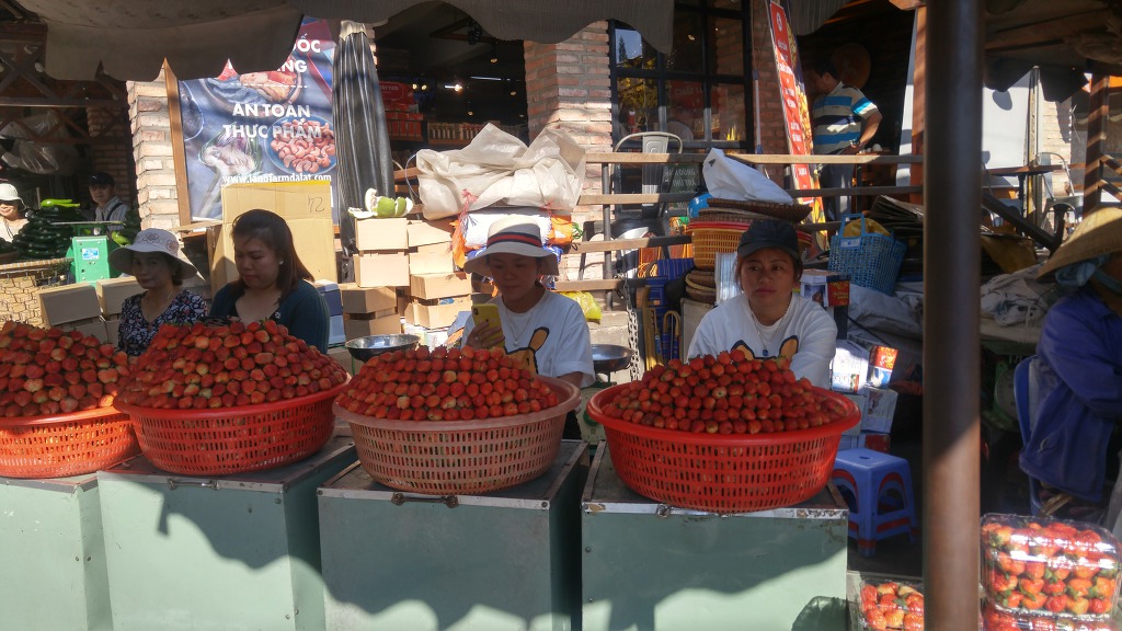 다시 차를 타고 간 곳이 “High tech strawberry garden”이라는 곳인데 달랏이 기후가 좋아 각종 농작물이 잘 되어 첨단 기술을 바탕으로 농사짓는 것을 보여주는 농원이었다. 그러나 별로 첨단 기술이라 할 수준은 아니고 비닐하우스에 자동 급수 정도로 조금 과학 영농을 하는 수준으로 보였다. 상점에 들어가 커피 값을 대강 알아보고 과일 말린 것도 구경하다가 더 재미난 것을 보게 되었다.