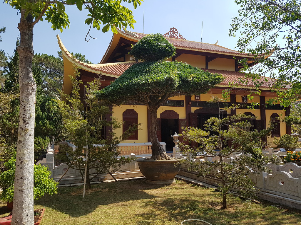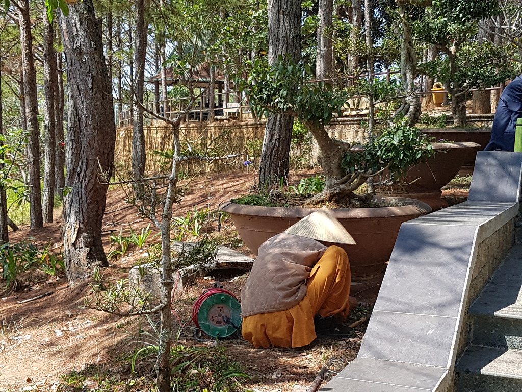 차를 조금 달려 죽림선원이란 절에 도착했는데 꽃이 많은 것은 물론이거니와 꽃을 가꾸는 그 정성이 대단하다. 초봄에 피는 군자란과 6월에 피는 접시꽃, 10월에 피는 코스모스가 맨드라미, 달리아, 수국, 개량 국화, 난초 등과 함께 계절도 없이 시간을 초월한 화원을 이루고 있다. 어떻게 각 계절에 각각 피는 화초들이 한 계절에 꽃을 피울 수 있는지 매우 궁금했다. 아마 각 화초들이 꽃을 피울 공통 요소를 달랏이란 고원지대가 가지고 있겠지. 게다가 잘 손질되고 절제된 분재까지 곳곳에 자리 잡고 있어 감탄을 자아낸다. 하지만 내 보기 좋으라고 남에게 빈궁한 삶을 요구하는 느낌이 들어 궁극적으로 나는 분재를 좋아 하지 않는다. 오히려 마음 놓고 훤칠한 키로 미끈하고 우뚝하게 자란 나무가 우리에게 주는 장(壯)한 마음은 저래도 살까하는, 극도의 옹색한 삶을 사는 분재의 신기함에 비할 바 아니다. 우린 흔히 소나무라고 하면 우리나라 산천에 있는 꼬꾸라진 늙은 할매 같은 소나무를 생각하고 우리나라가 소나무의 원산지 정도로 생각하는듯한데 나는 베트남에도 소나무가 자라고 그것도 키가 15m 정도로 곧게 자랄 줄은 내 눈으로 보기 전에는 믿을 수 없었다. 이곳이 지대가 높아서인지 반 아름은 되어 보이는 탐나는 소나무들이 숲을 이루는 것을 보고 우리나라 소나무는 자연 분재가 되어 젊은 나이에 조로(早老)병에 걸려 늙은이 몰골을 하고 있구나 하는 생각을 버리지 못했다.