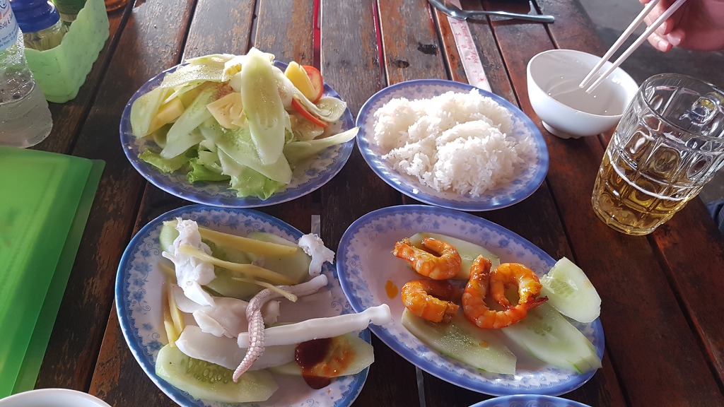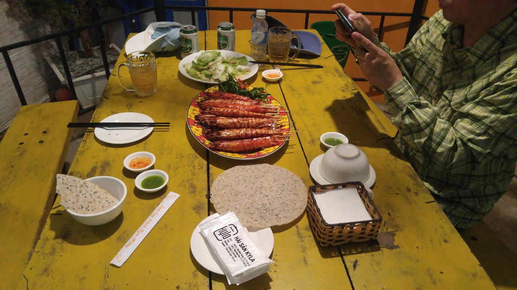 그래도 점심은 먹어야 하기에 근처 베트남 가정식 식당에 가서 새우구이와 돼지고기 스테이크, 샐러드와 맥주 2병을 주문했는데 버터에 구운 새우가 상당히 맛있다. 햇볕을 싫어하는 나는 다시 방에 누워 뒹굴고 안선생은 거리를 산책한다고 나갔다. 저녁은 어제 저녁을 먹은 “Lam Tong”에 가서 오징어 데침, 새우볶음, 샐러드, 맥주를 시켰는데 점심 때 먹은 새우구이와 너무 차이 나게 빈약했다.