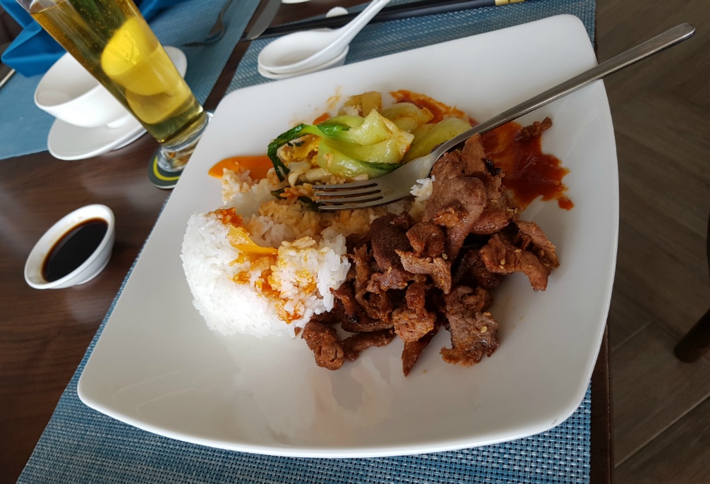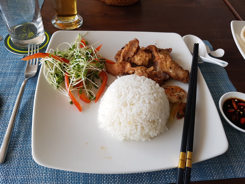 버스가 거의 무이네 시내에 도착한 듯하여 호치민에서 익힌, 주소로 집 찾기를 해 보았다. 일단 우리가 갈 “Joe’s Cafe”의 주소를 본 후 길가의 가게들의 주소를 보며 숙소를 찾으려 했는데 이미 지나와도 한참을 더 지나왔다. 걸어가자고 우기는 안선생을 겨우 설득해 택시를 탔더니 3만동이 나왔다. 이 더위에 울퉁불퉁한 보도로 캐리어를 끌며 걸어왔으면 둘 중 하나는 사망할 지경에 이르렀을 것이다. 일단 체크인하고 2박의 요금으로 118만 동을 지불했다. 그리고 옆에 식사하는 동양인 여자애들이 있어 우리도 여기서 식사하기로 했다. 안선생이 한국 애들로 알고 너희들이 지금 먹는 메뉴가 무엇이냐 등 여러 가지를 물었는데 중국 애들이었다. 그래도 무슨 말인지 알아듣고 메뉴에서 찾아주었다. 그래서 먹은 것이 돼지고기 덮밥과 맥주인데 그런대로 먹을 만했다.