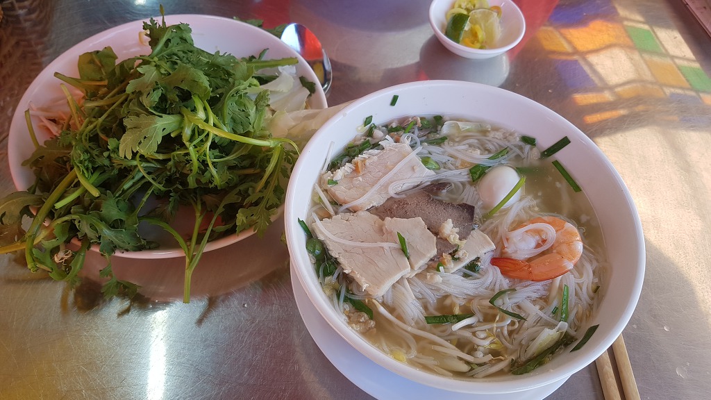 점심때가 된 지라 우선 밖으로 나가 보기로 했다. 나가면서 리셉션 데스크에 세탁물을 맡기고 호텔 입구에서 10m나 갔을까? 바로 쌀국수와 간단한 음료 등을 파는 동네식당이 있어 쌀국수 스페셜을 주문했다. 스페셜은 메추리알 하나 들어갈 걸 2개 넣고 새우 1마리 넣을 걸 2마리 넣어주고 20,000만 동에 5,000동을 더 받는 것을 말한다. 생각 외로 시골 쌀국수치고는 맛이 깔끔하고 담백하다. 나는 이제 각종 향채에 대한 거부감은 모두 극복한 지라 고수니, 쑥갓이니 뭐니 가리지 않고 뜯어 넣고 라임 반 조각을 짜 넣은 후 베트남 고추 썬 것 대여섯 개 넣었다가 고추는 반드시 건저내고 먹는다. 같은 쌀국수라도 집집마다 사람마다 맛이 달라 자주 먹어도 질리지 않는다.