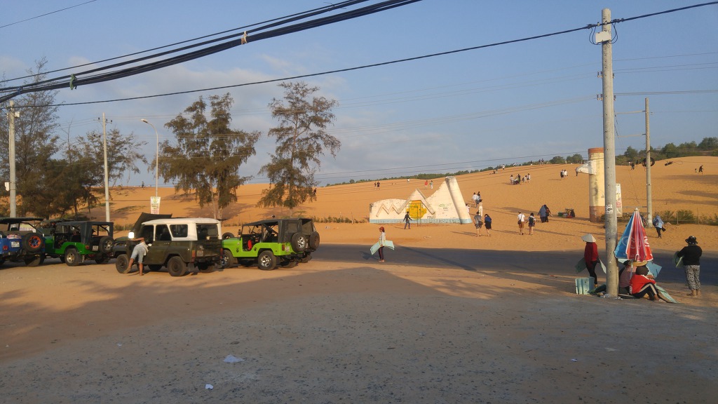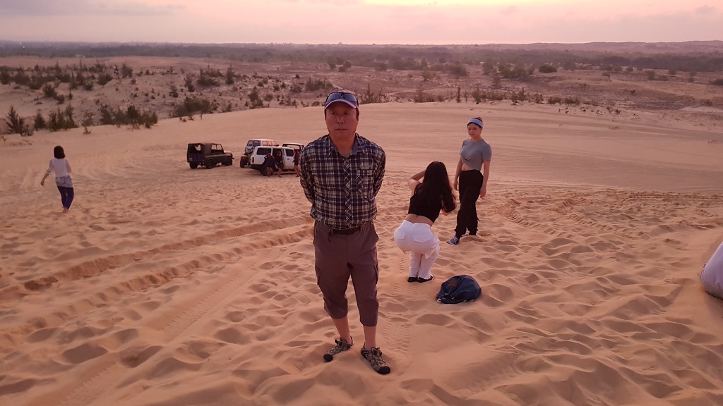 4시에 일어나 대강 입고 로비로 갔더니 곧 베트남 국기인 금성홍기를 펄럭이는 Jeep이 요란한 소리를 내며 픽업을 왔다. 이 골목 저 골목으로 돌아다니더니 젊은 서양인 커플을 태우고 “White sand dune” 입구에 도착했다. 아직 날은 밝지 않아 어둑어둑한데 어디로 가야하는지 알 수도 없고 우두커니 서 있으니 모래 꼭대기까지 사륜구동차로 40만동에 태워 준다고 한다. 선택의 여지가 없다. 그러나 날씨가 흐려 일출을 보지는 못하고 젊은 커플들이 갖가지 포즈를 연출하며 자연스러움을 가장한 가증스런 사진 찍는 것만 실컷 구경했다. 사진 찍는 걸 보면 정말 저러고 싶을까할 정도로 여자들은 용기가 있고 뻔뻔하기까지 하다.