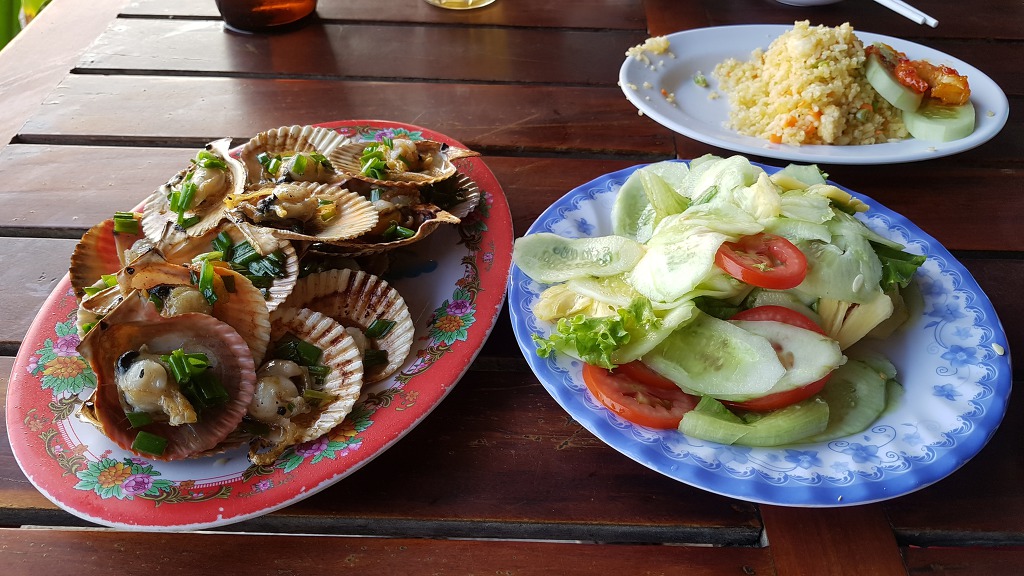 내일의 일정은 무이네 투어였는데 “Joe’s Cafe”의 리셉션의 아가씨에게 예약이 가능하냐고 했더니 된다고 한다. 내일 새벽 4시 30분에 호텔 앞에서 출발하기로 하고 1인 165,000동으로 예약을 했다. 그리고 나는 숙소에 들어가 쉬고 안선생은 혼자 거리 구경하며 산책을 나갔다 와서 샤워를 했다. 조금 더 쉬다가 거리 구경을 하다가 커피 한잔 마시고 숙소에서 쉬면서 구글지도에서 찾아둔 “Lam Tong”이란 베트남 식당으로 가서 볶음밥 1그릇, 가리비 1㎏, 맥주 2병, 샐러드 1접시를 주문했는데 샐러드가 너무 맛있어 하나 더 주문했다. 그래봐야 192,000 동이니 우리 돈으로 9,600원이고 일인 당 4,800원이다. 우리나라로 보면 맥주 1병 값에서 조금 지난다.